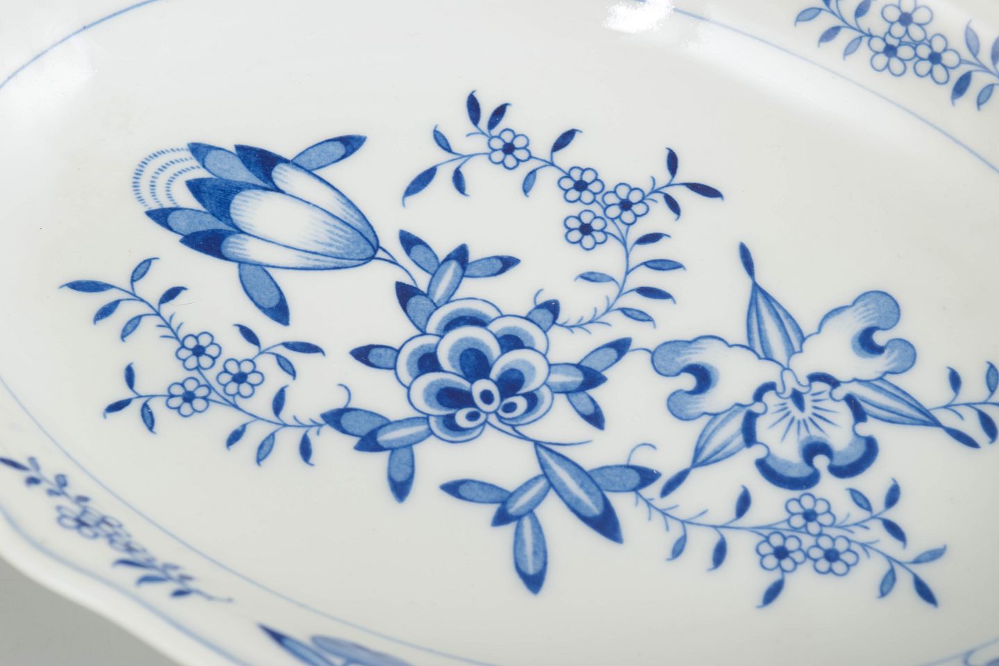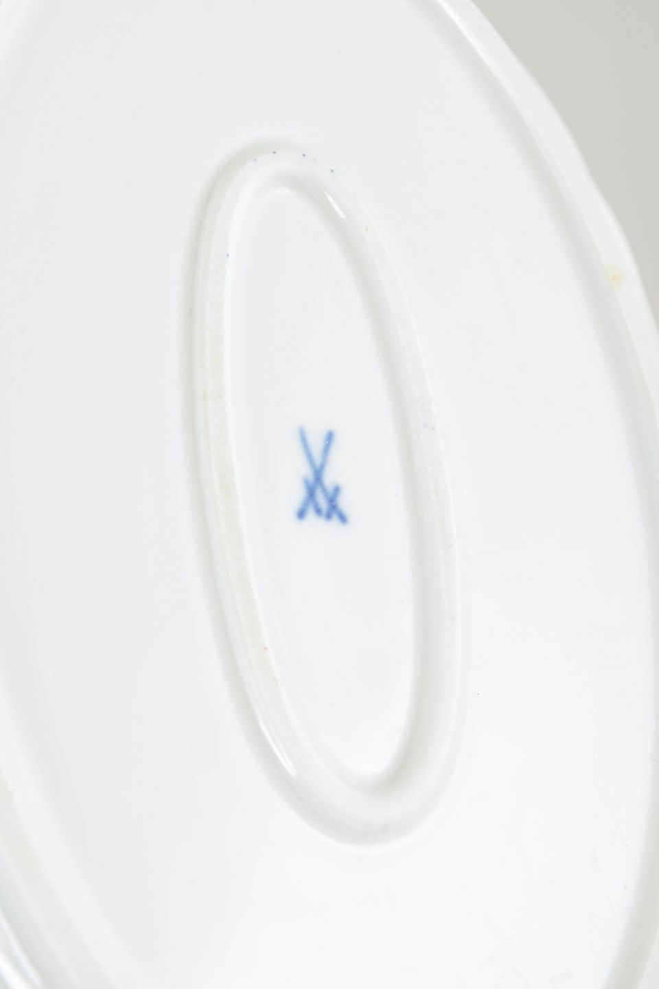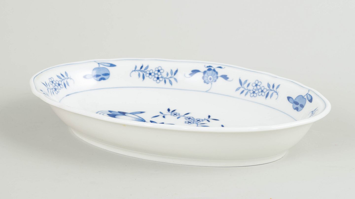 Oval bowl in hand-painted porcelain with Blue Orchid decoration. Produced by Meissen and marked with the Meissen crossed swords. Cancelled with two incised lines on the underside.