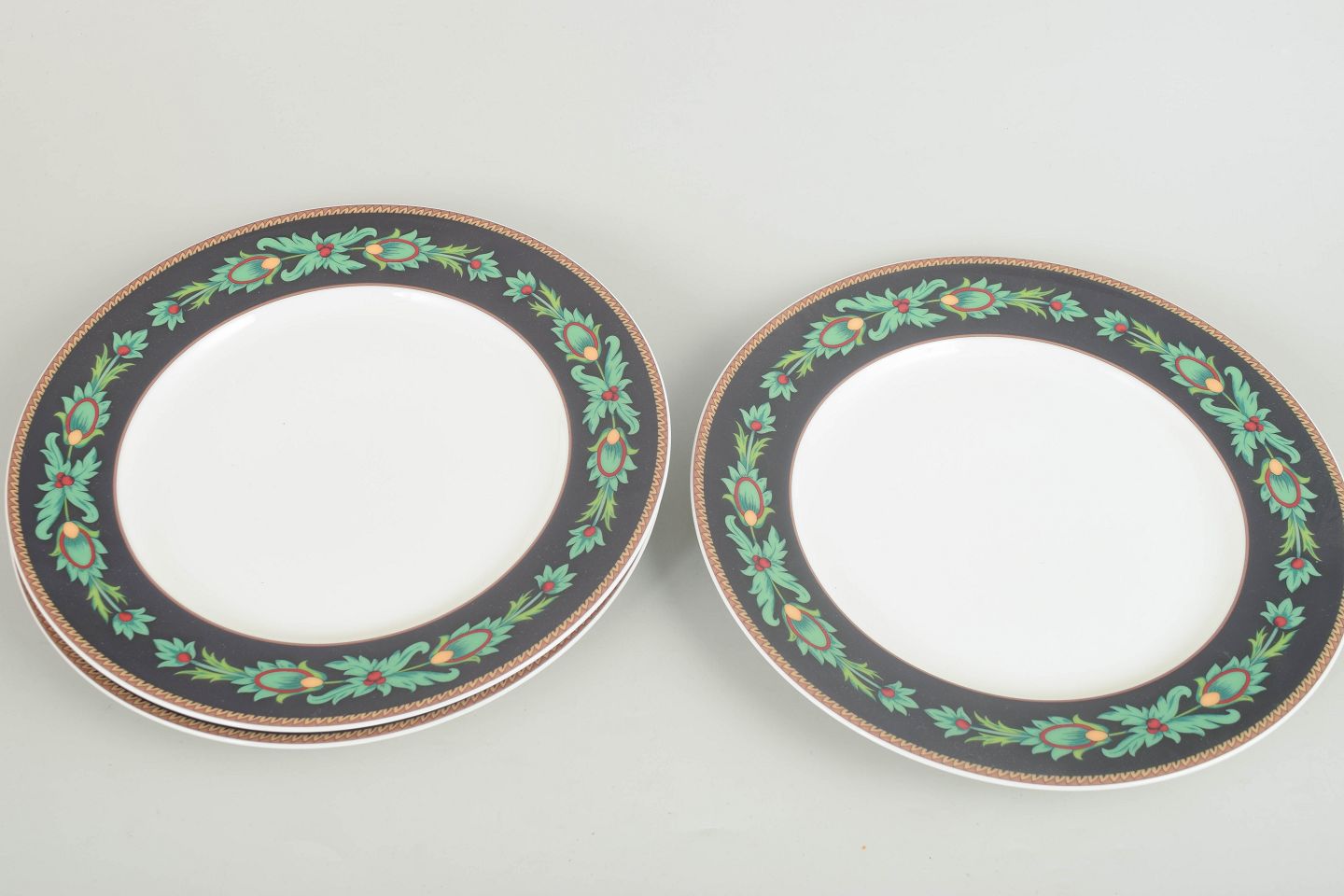 Set of three porcelain dinner plates with a decorative border in green and gilt tones against a dark ground. The plates were produced by Rosenthal after a design by Nina Campbell. Each plate measures 26 cm in diameter.