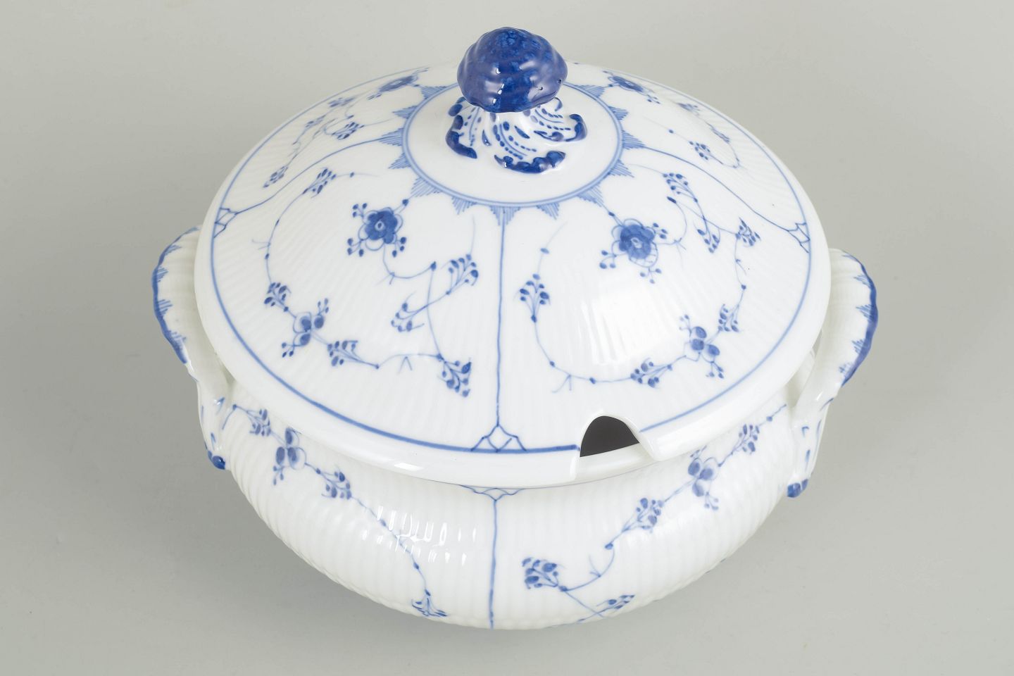 Large soup tureen with lid in hand-painted porcelain from the Blue Fluted Plain service with classic underglaze cobalt blue decoration and fluted surfaces. Model 1/222. H. 23 cm, D. 26 cm. First factory quality. Produced around 1900.