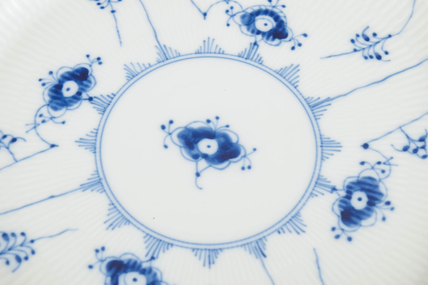 Large round platter in hand-painted porcelain from the Blue Fluted Plain service with classic underglaze cobalt blue decoration and fluted surfaces. Model 1/107. H. 4 cm, D. 33 cm. First factory quality. Produced in the 1980s.