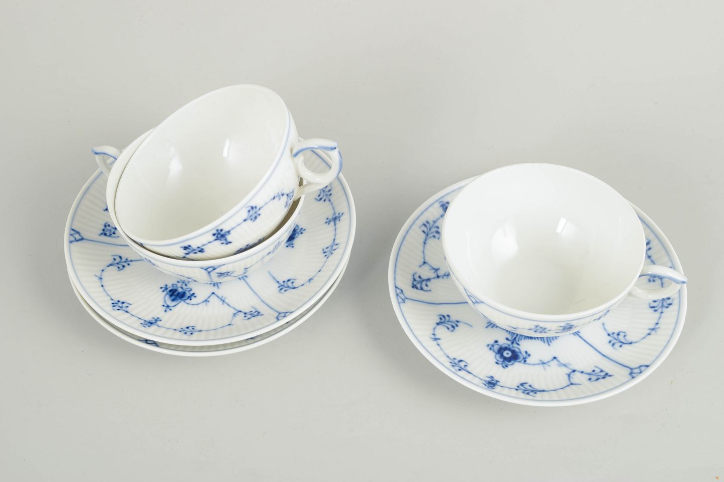 Set of three tea cups with matching saucers in hand-painted porcelain from the Blue Fluted Plain service with classic underglaze cobalt blue decoration and fluted surfaces. Model 1/76. Cups H. 5 cm, D. 12 cm. Saucers D. 15 cm. First factory quality. Produced in the 1960/80s.