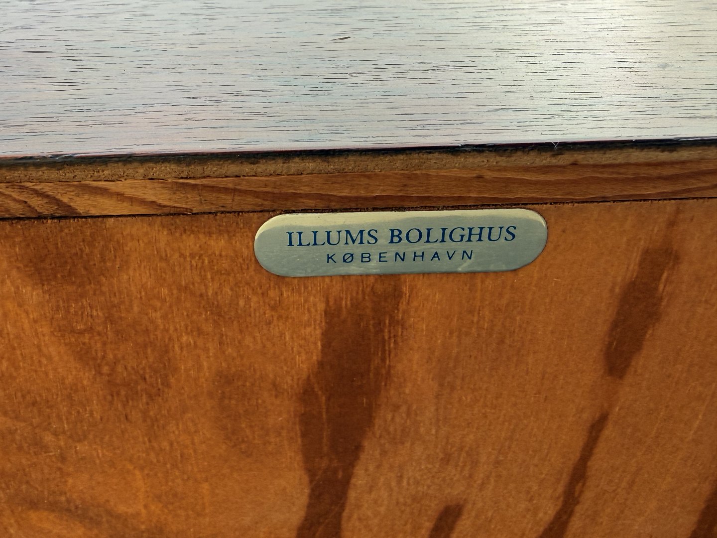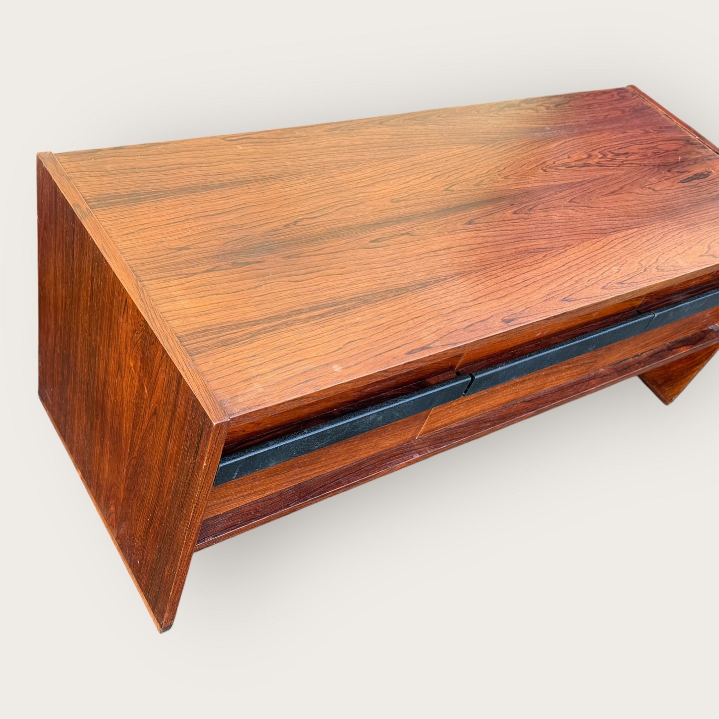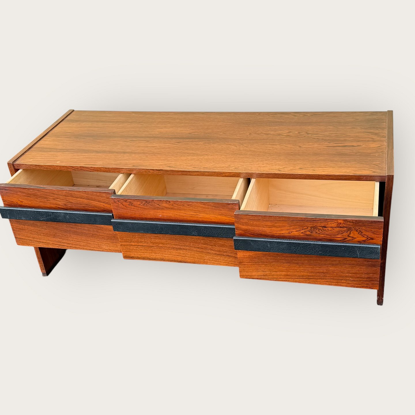Low sideboard in rosewood veneer, three drawers with leather-covered handles, Discontinued and marked from Illums Bolighus, Dimensions: HxWxD 46x116x45cm, has been a large hallway set in combination with the Rosewood Mirror, item no. 632831 *In good used condition with few signs of wear*