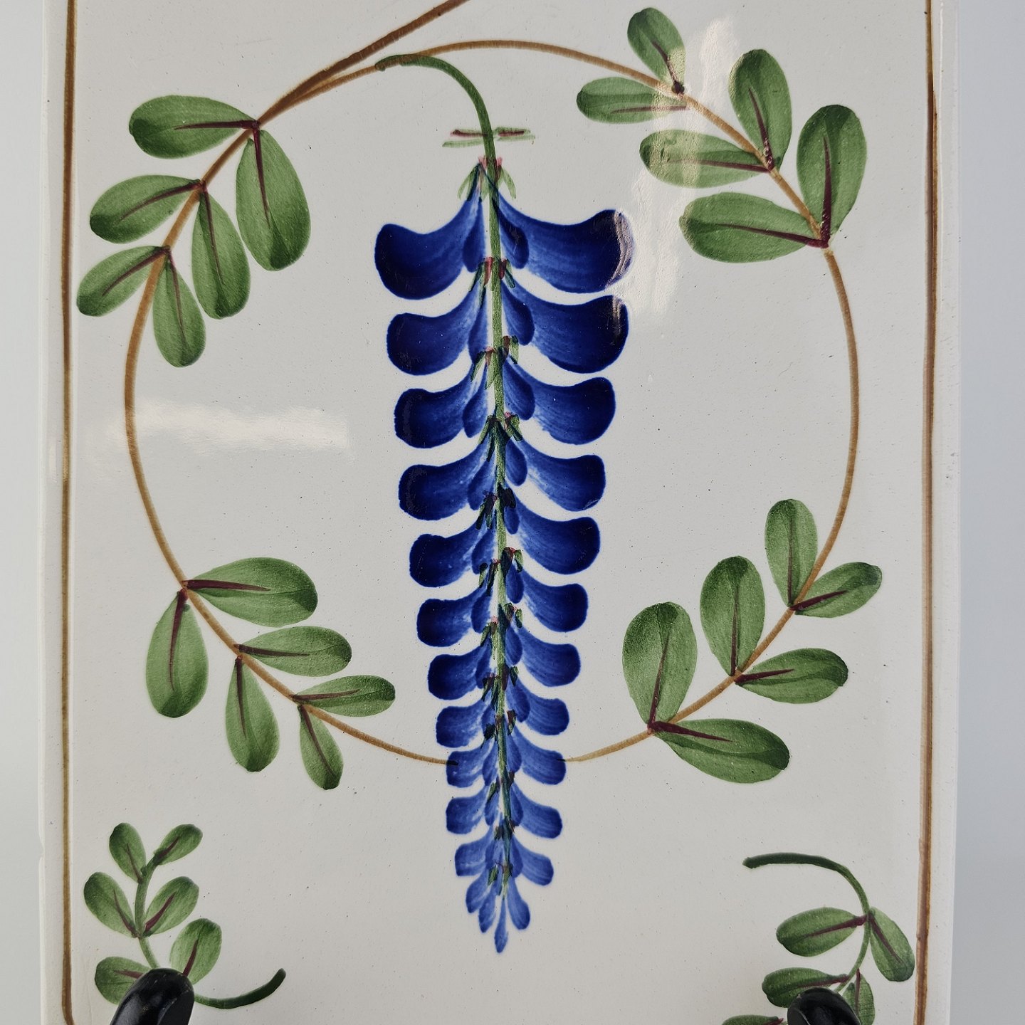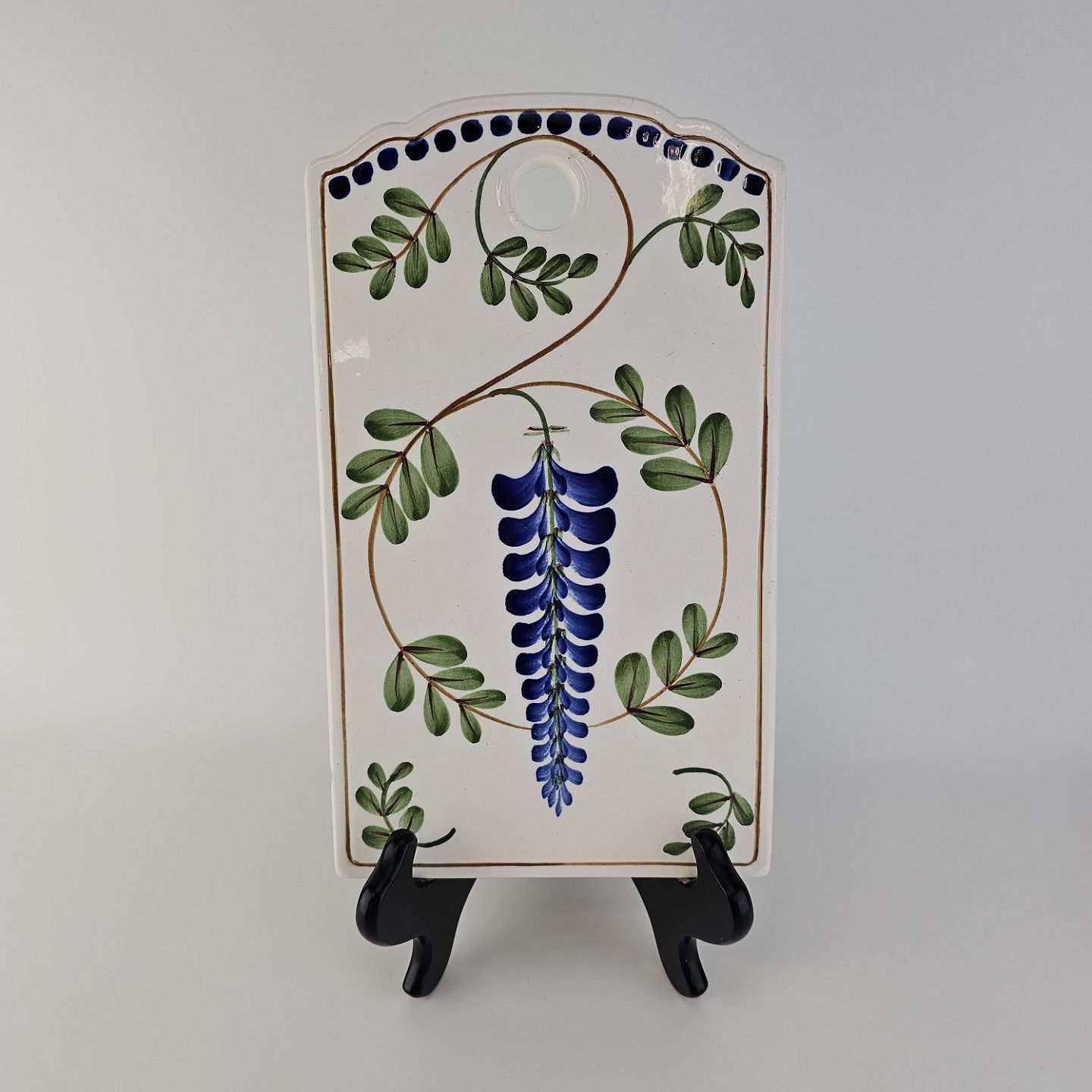 Fajancestel med dekoration af ranker af blåregn og blade på lys baggrund afsluttet med kant af runde blå pletter.