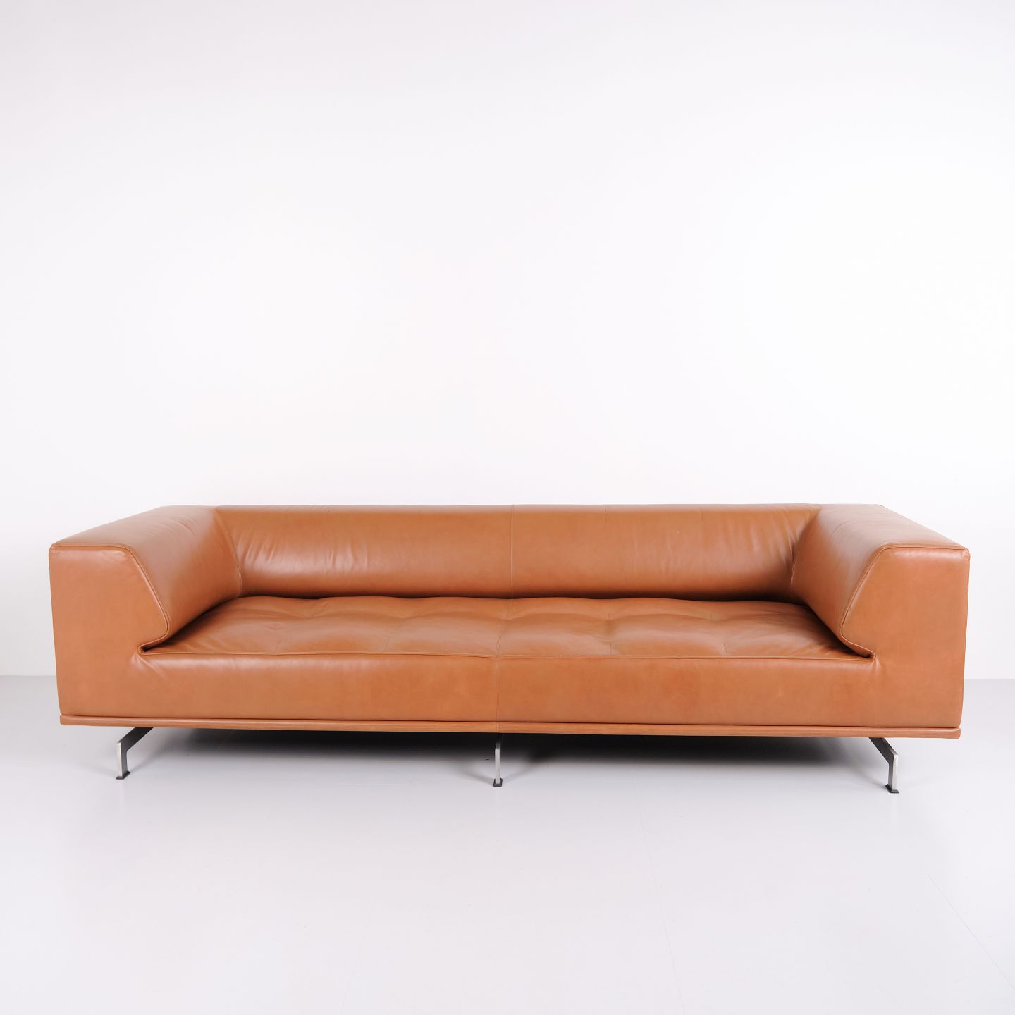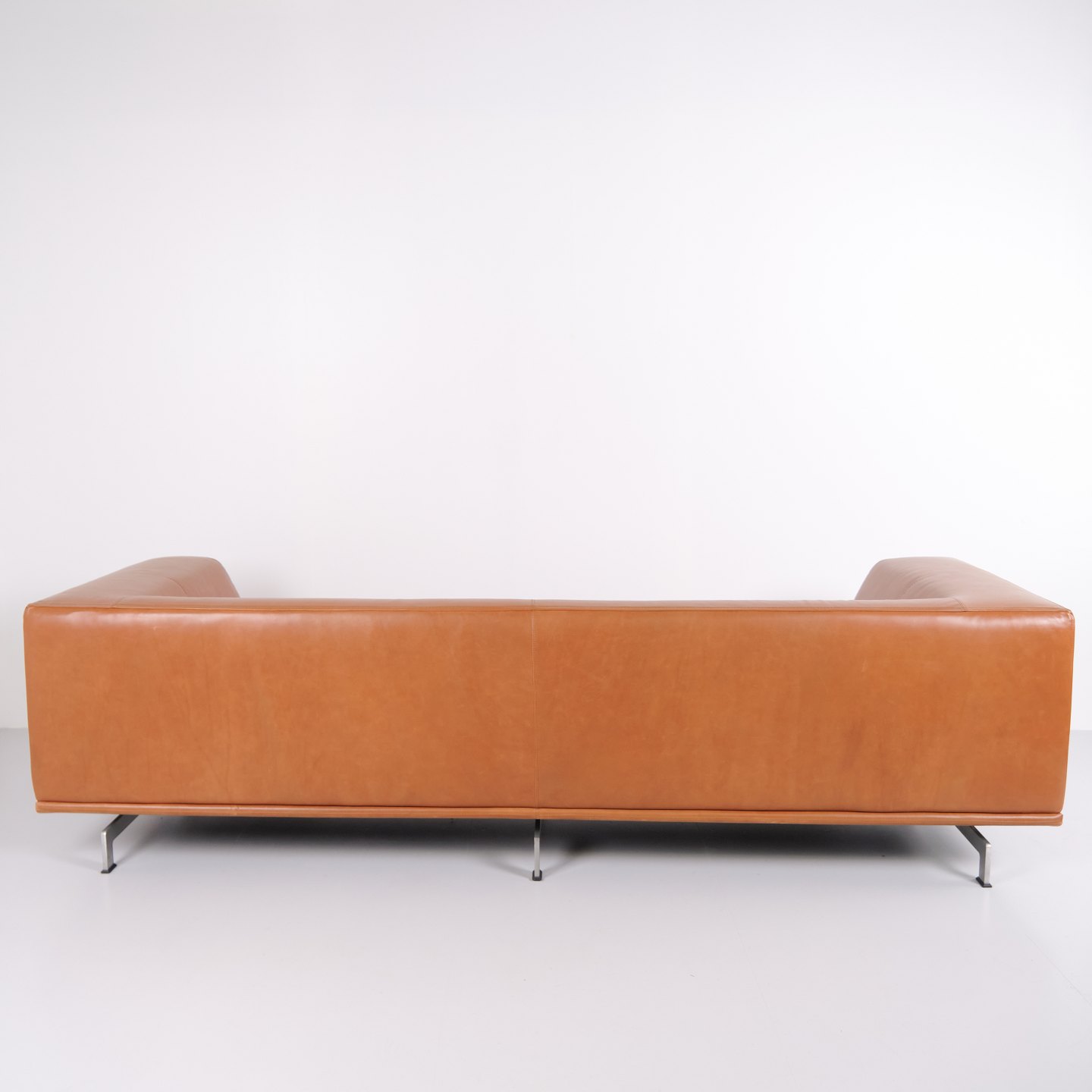 Erik Jørgensen Delphi sofa model EJ 450 designed by Hannes Wettstein in cognac leather with frame in brushed aluminium. Modern Scandinavian design.