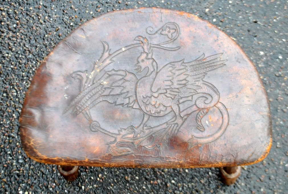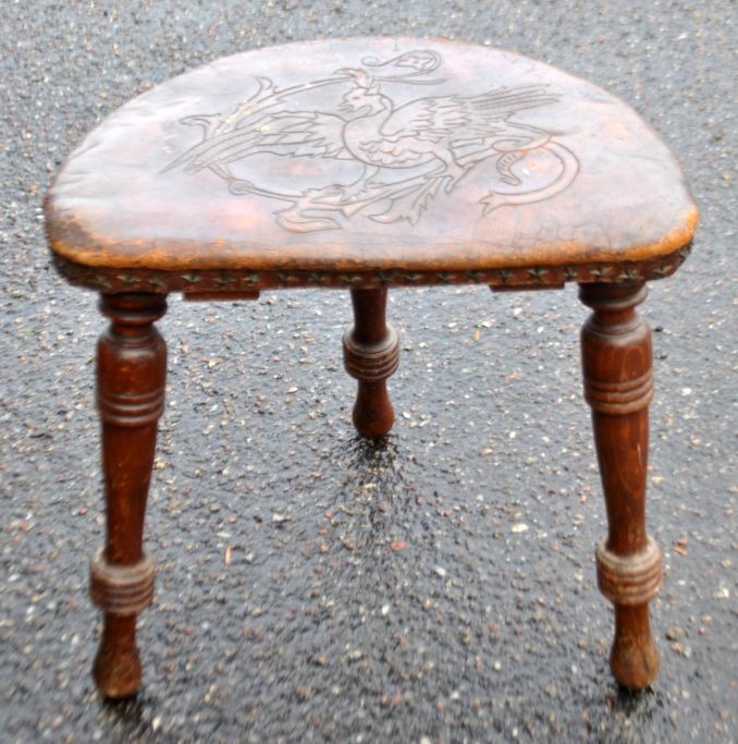 Three-legged wooden stool with leather seat, 19th century. Carved leather with rooster decoration. Rivets in the shape of stars and flowers. H: 39 cm. W: 40 cm. D: 33 cm.