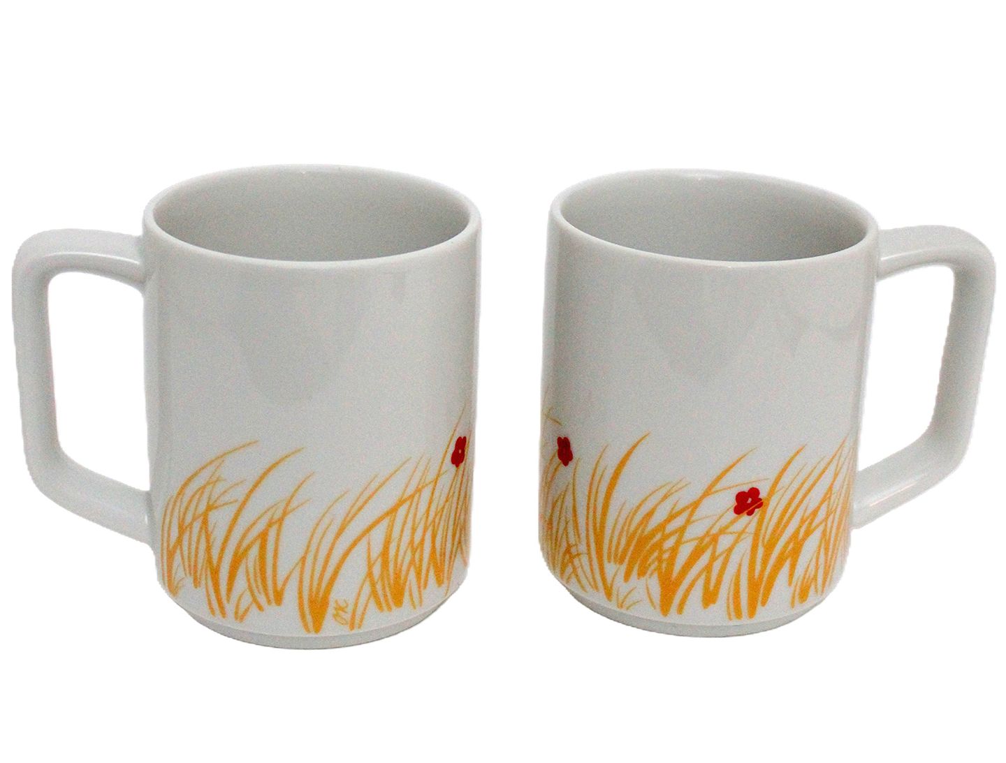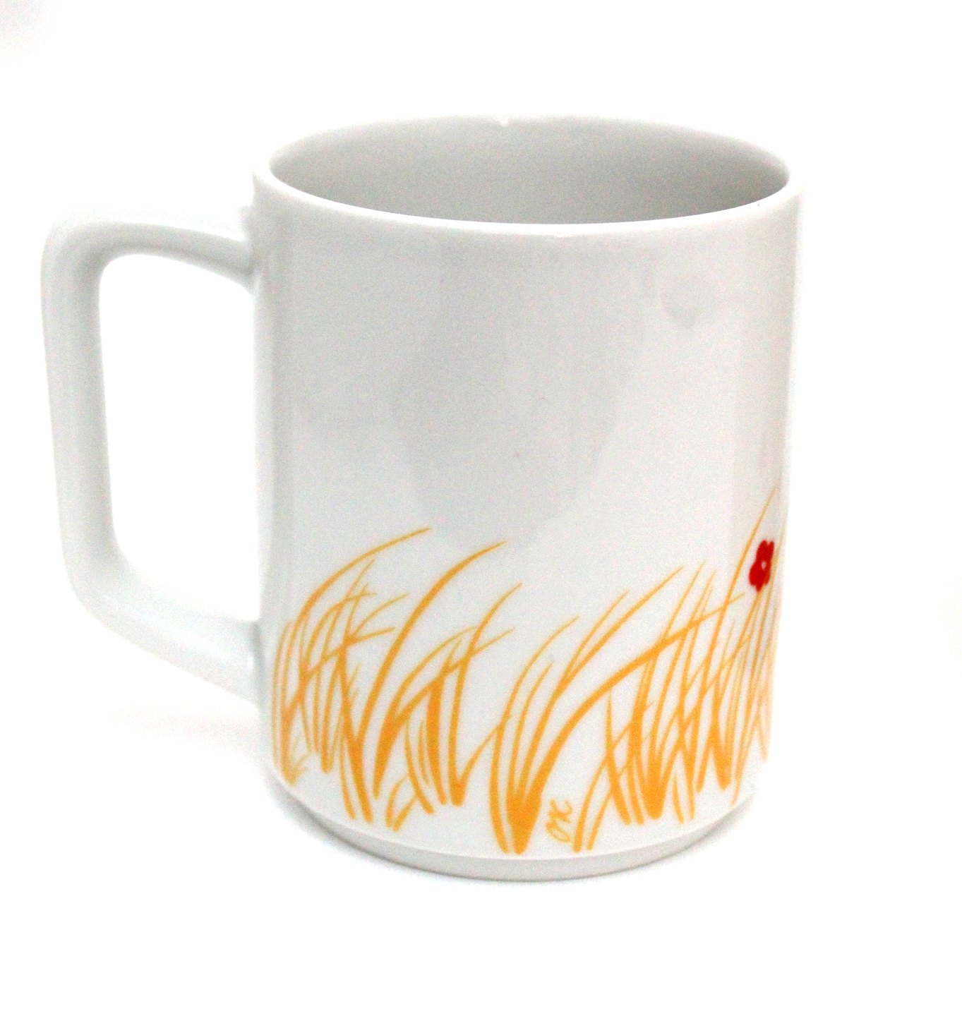 Text available in Danish: Royal Copenhagen, Picnic, Kaffekrus med gul dekoration. Designet af Grethe Meyer og Ole Kortzau. Nr. 6227. Dekoration 102. Højde 9,5 cm. Diameter 7,5 cm. Flot stand. I. sortering. Pris: 300 kr. stk. Lager: 2