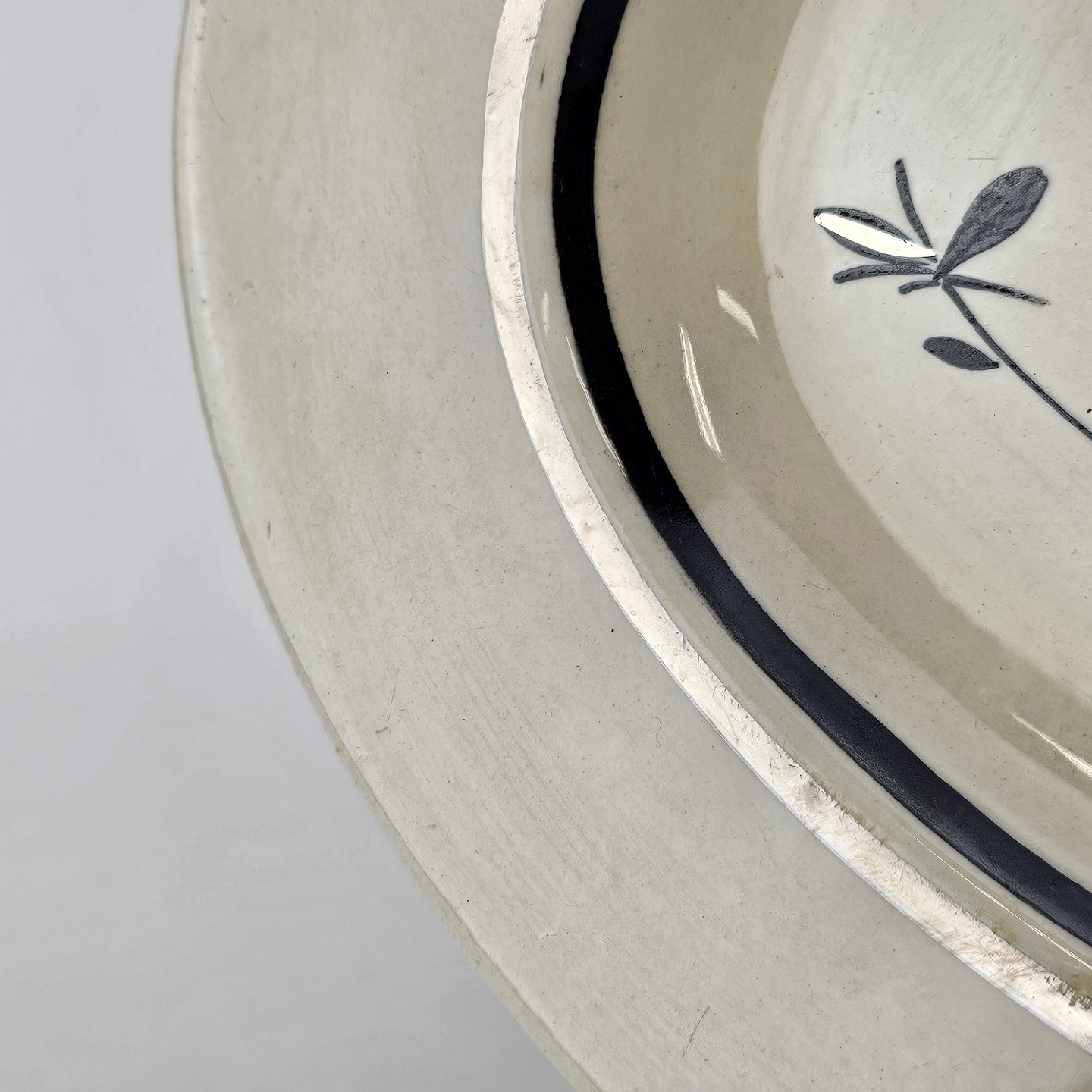 Råhvidt fajancestel i stelform E med dekoration af naturmotiver i sølv og sort farve.