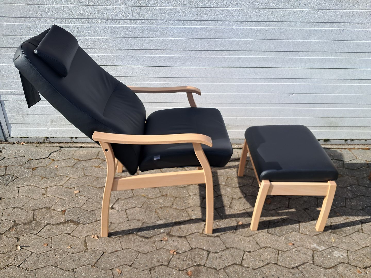 Farstrup lænestol og skammel i bøgetræ med læderbetræk, fra 2010erne.