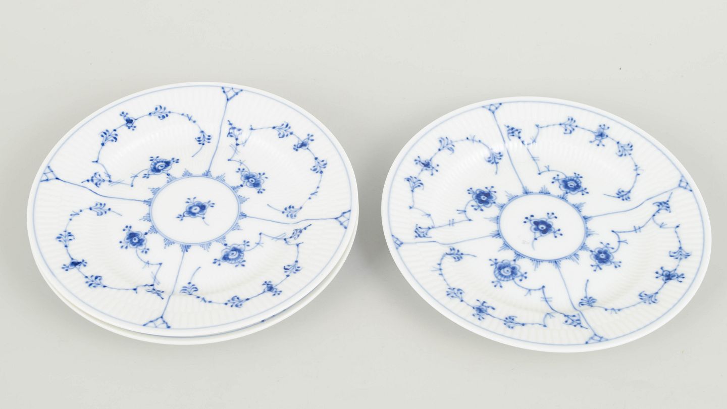 Set of three cake plates in hand-painted porcelain from Blue Fluted Plain with classic underglaze decoration in cobalt blue. Model 1/180. First factory quality. The plates measure D. 17 cm. Produced in the 1970s.