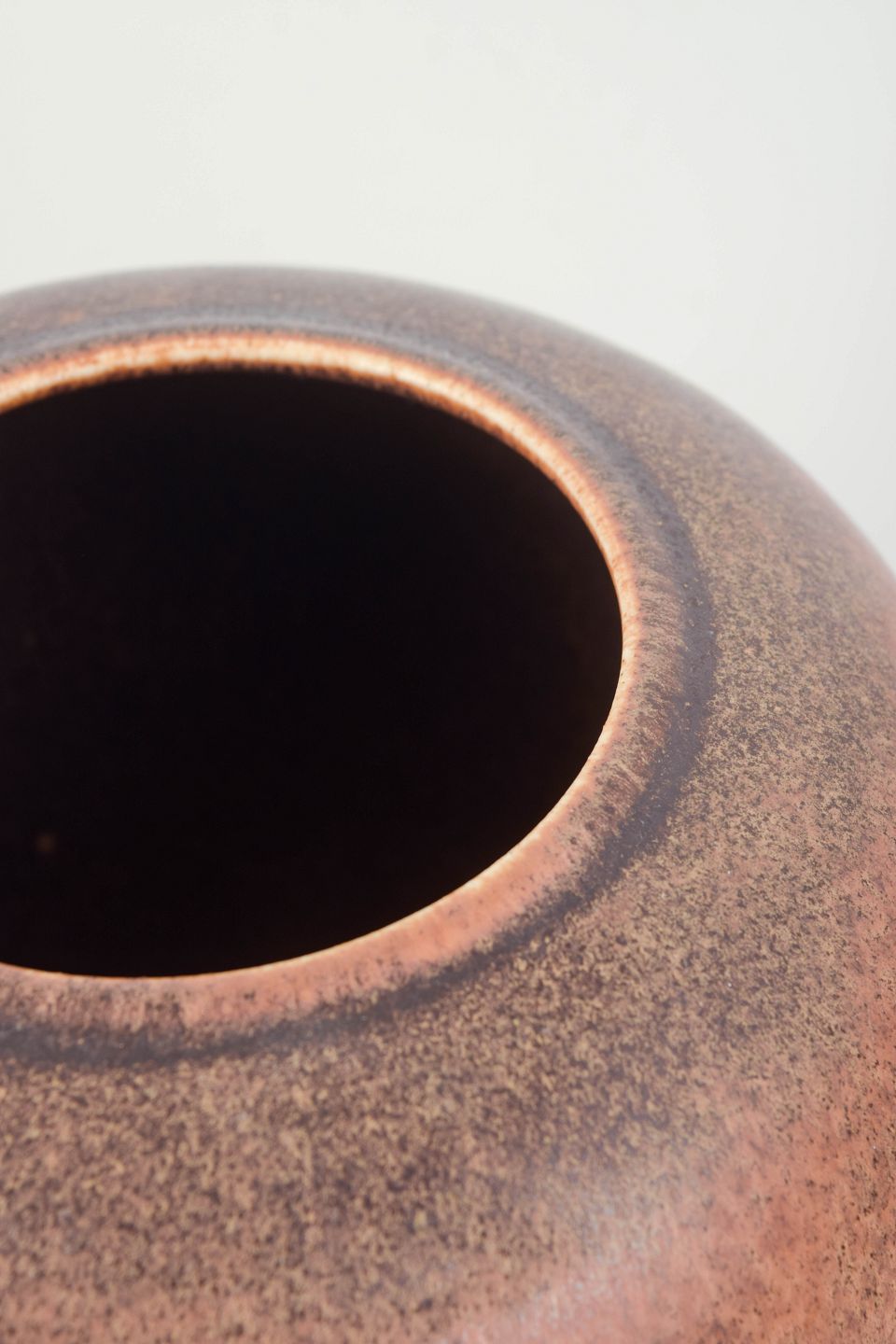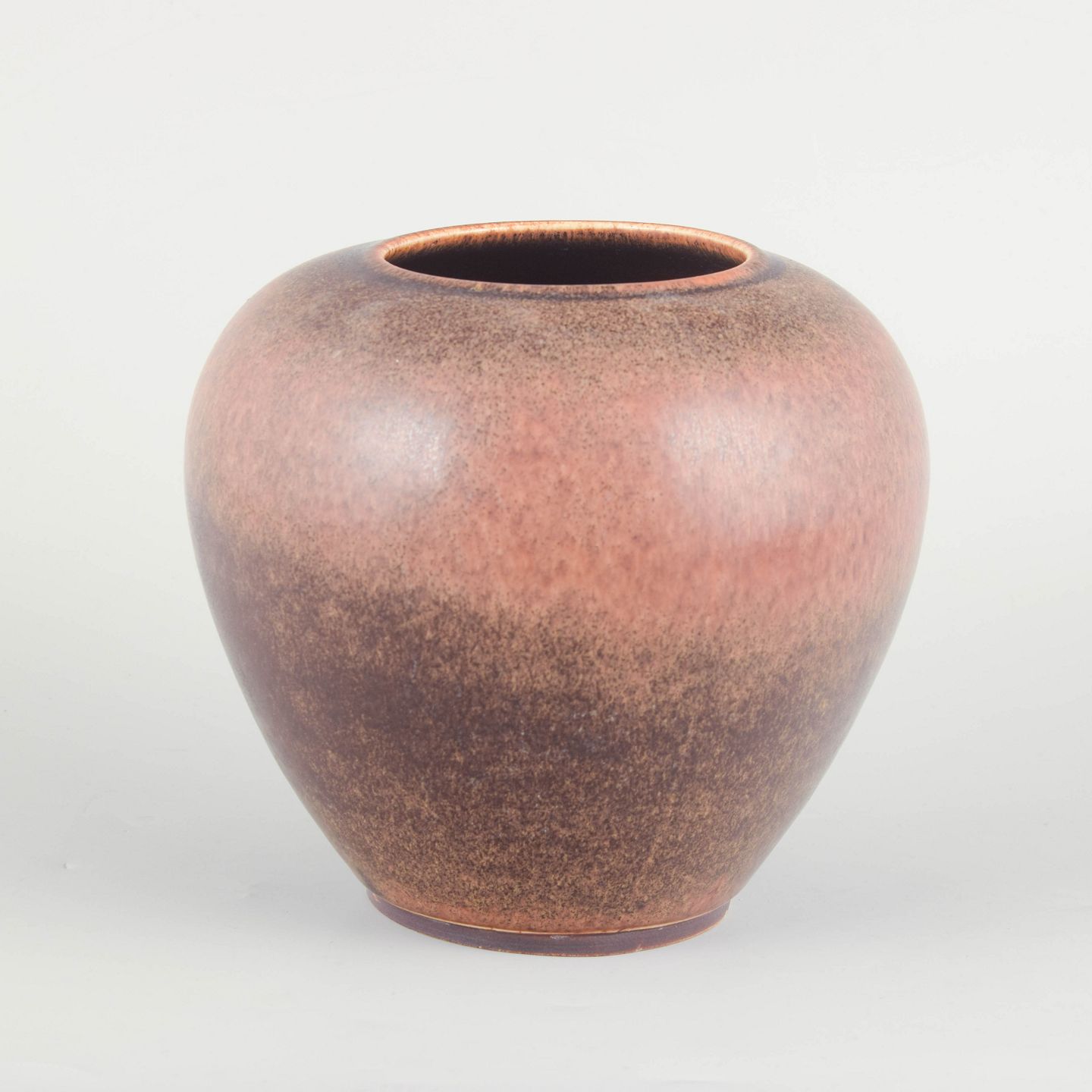 Large, rounded stoneware vase with wide opening and full-bodied silhouette. The glaze displays warm pink and brown tones with soft transitions and a deep, vibrant surface character, typical of Saxbo’s experimental glaze work.