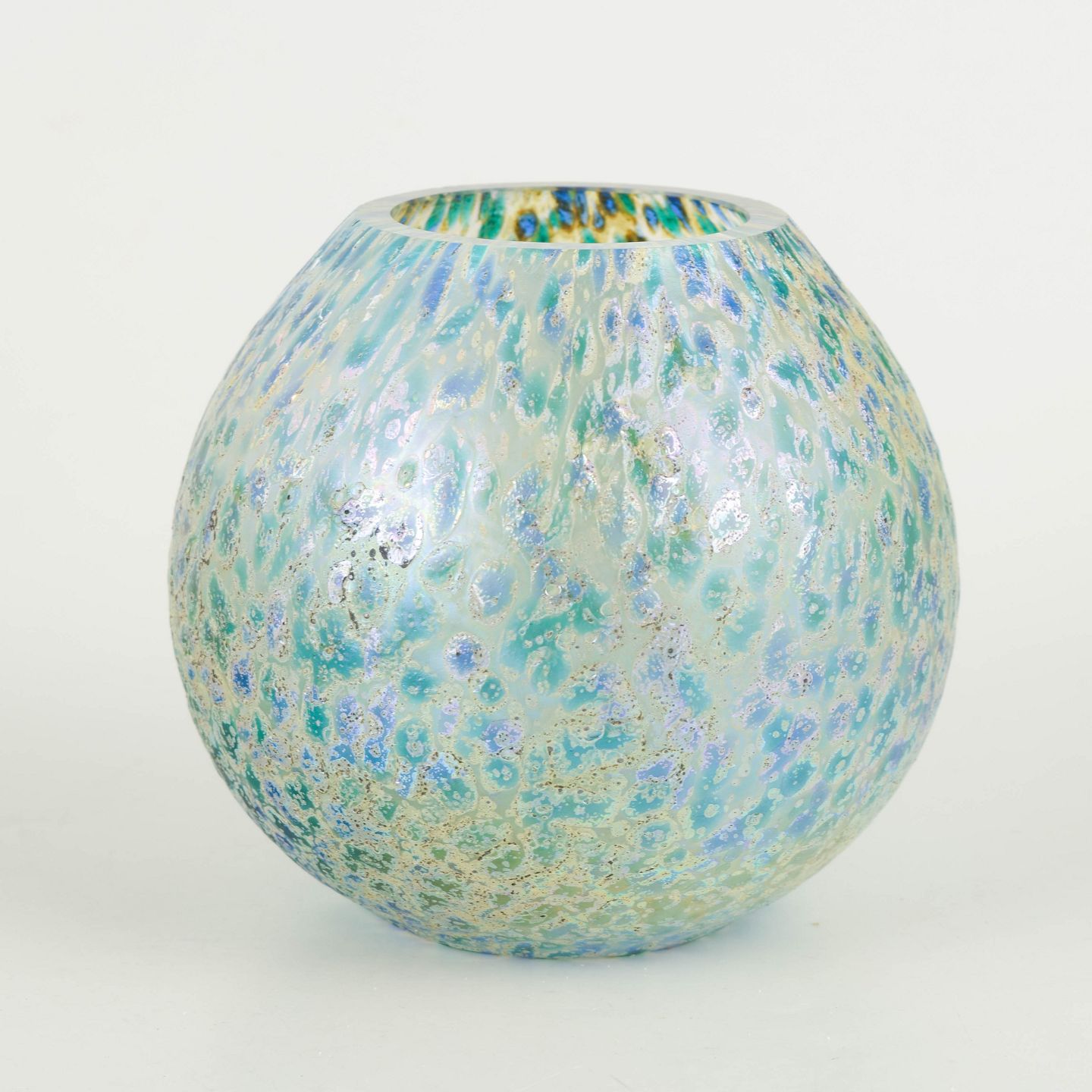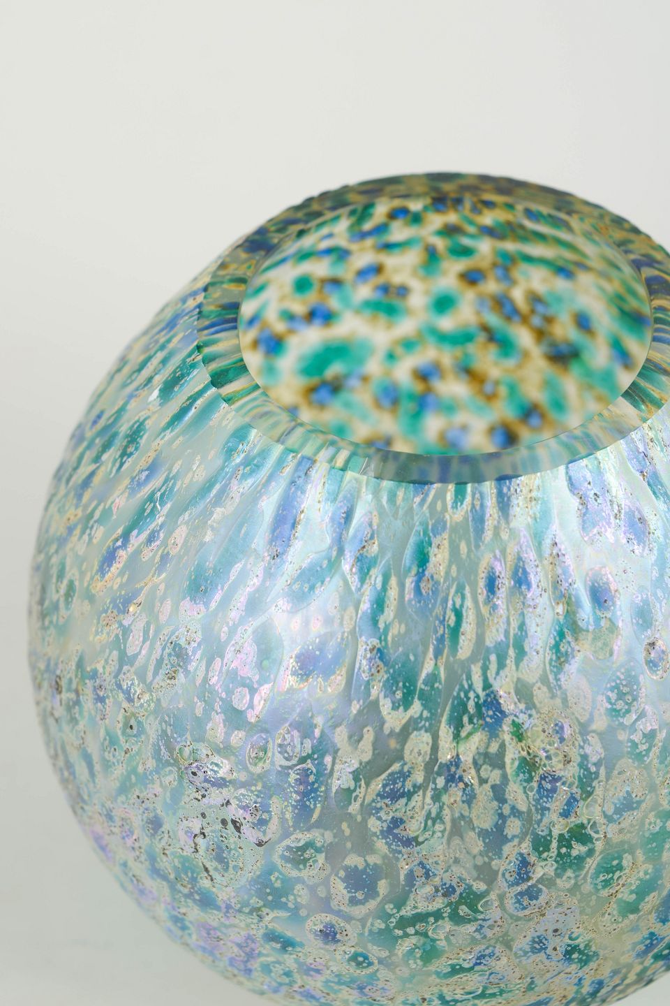 Globular vase in mouth-blown glass with a slightly narrowed opening and rounded body. The surface features a strong iridescent decoration in blue, green and golden tones with a dense, organic texture that creates a vibrant, almost mosaic-like colour play. The compact form combined with the rich surface effect is characteristic of Loetz production in the 1920s, when experimental decorative techniques continued beyond the art nouveau period.