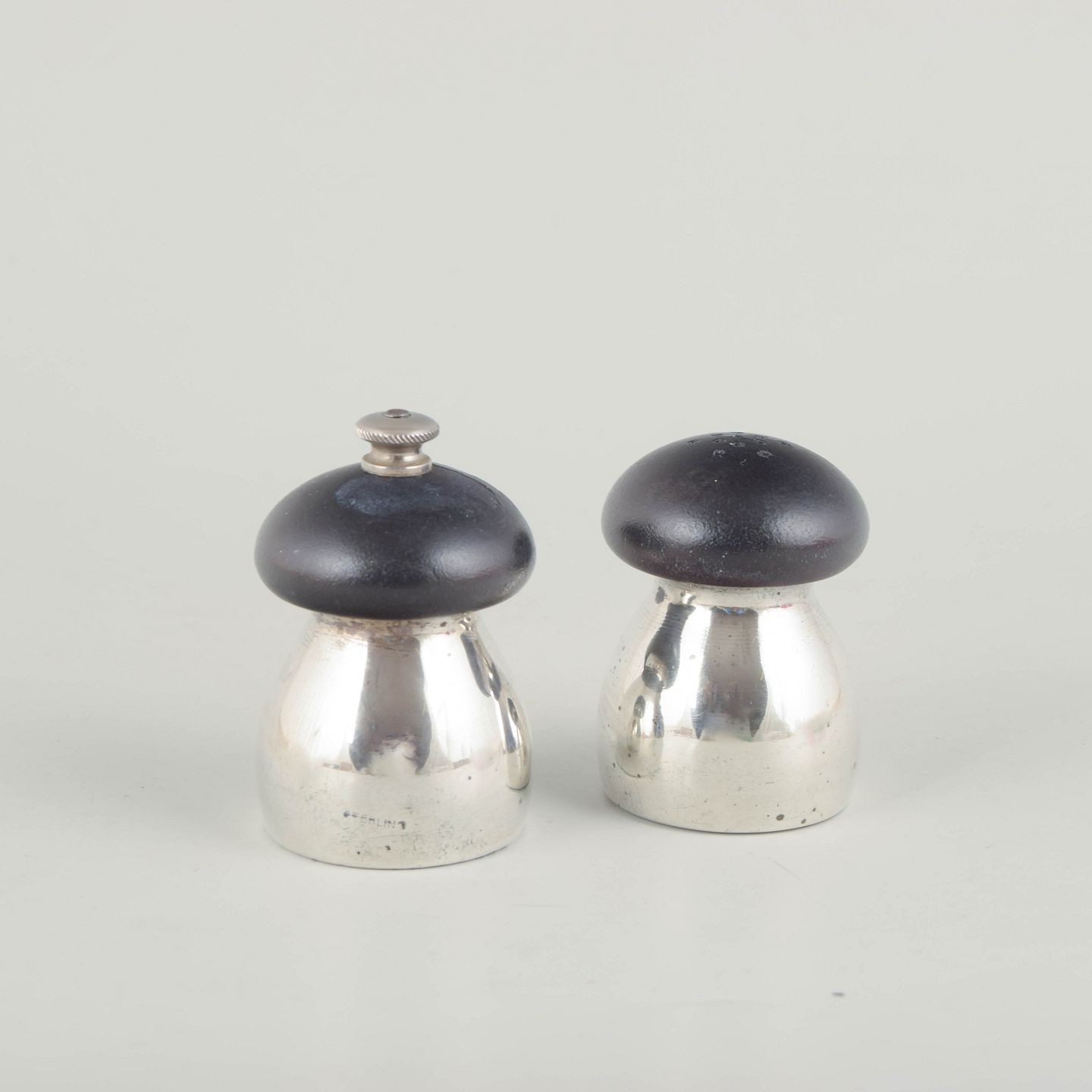 Pair of compact and elegantly shaped salt and pepper shakers in sterling silver with dark wooden finials. The softly rounded forms are characteristic of mid-20th-century Italian design.