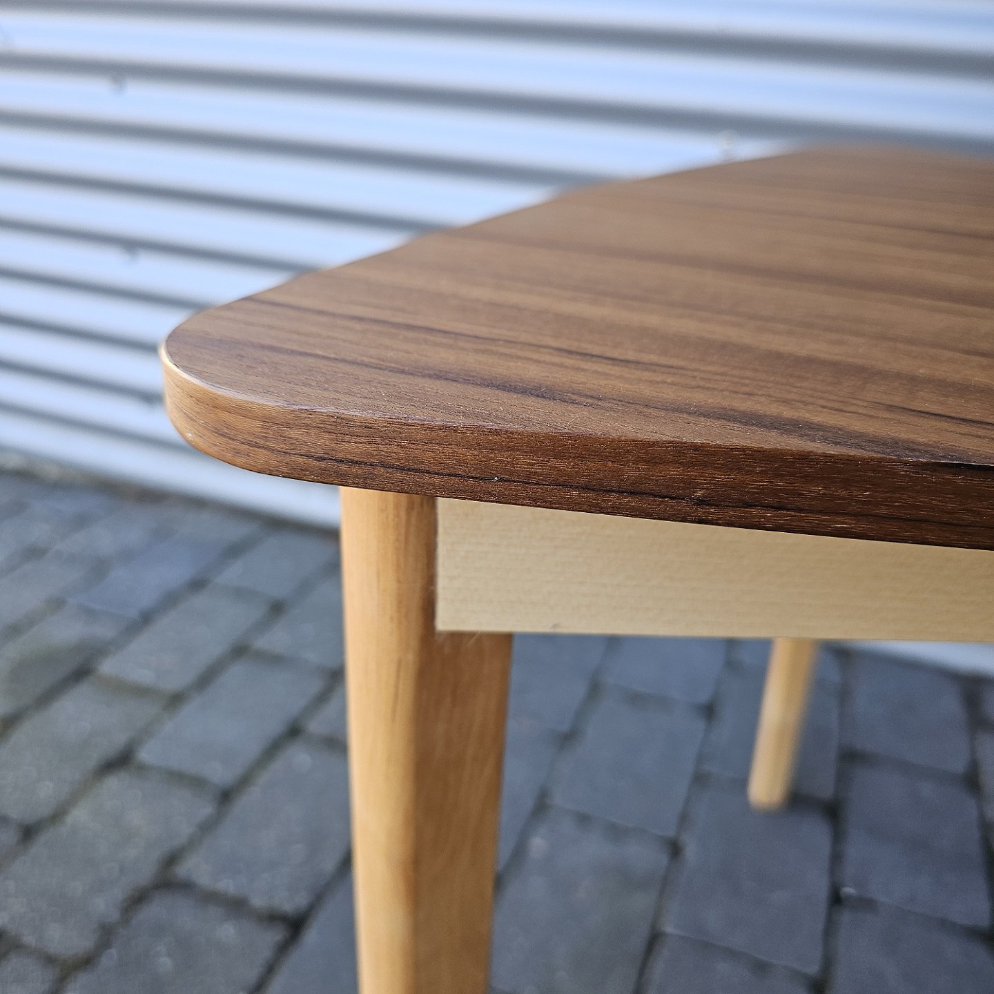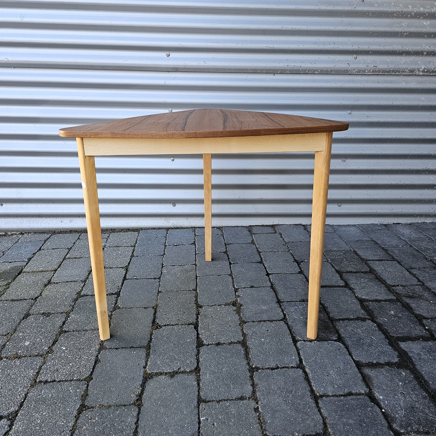 Trekantet sofabord med stel i bøg og bordplade i teaktræ