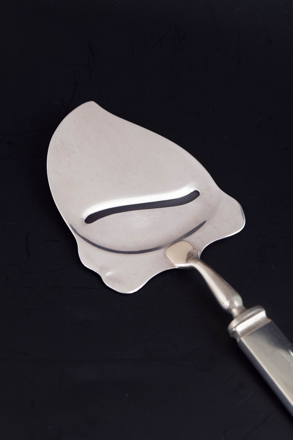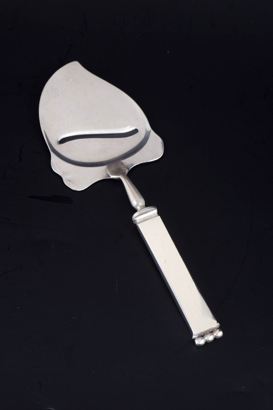 Art Deco cheese slicer in 830 silver and stainless steel. Model number 27 with a decorative handle in relief featuring a stylised floral motif. Produced by Evald Nielsen.