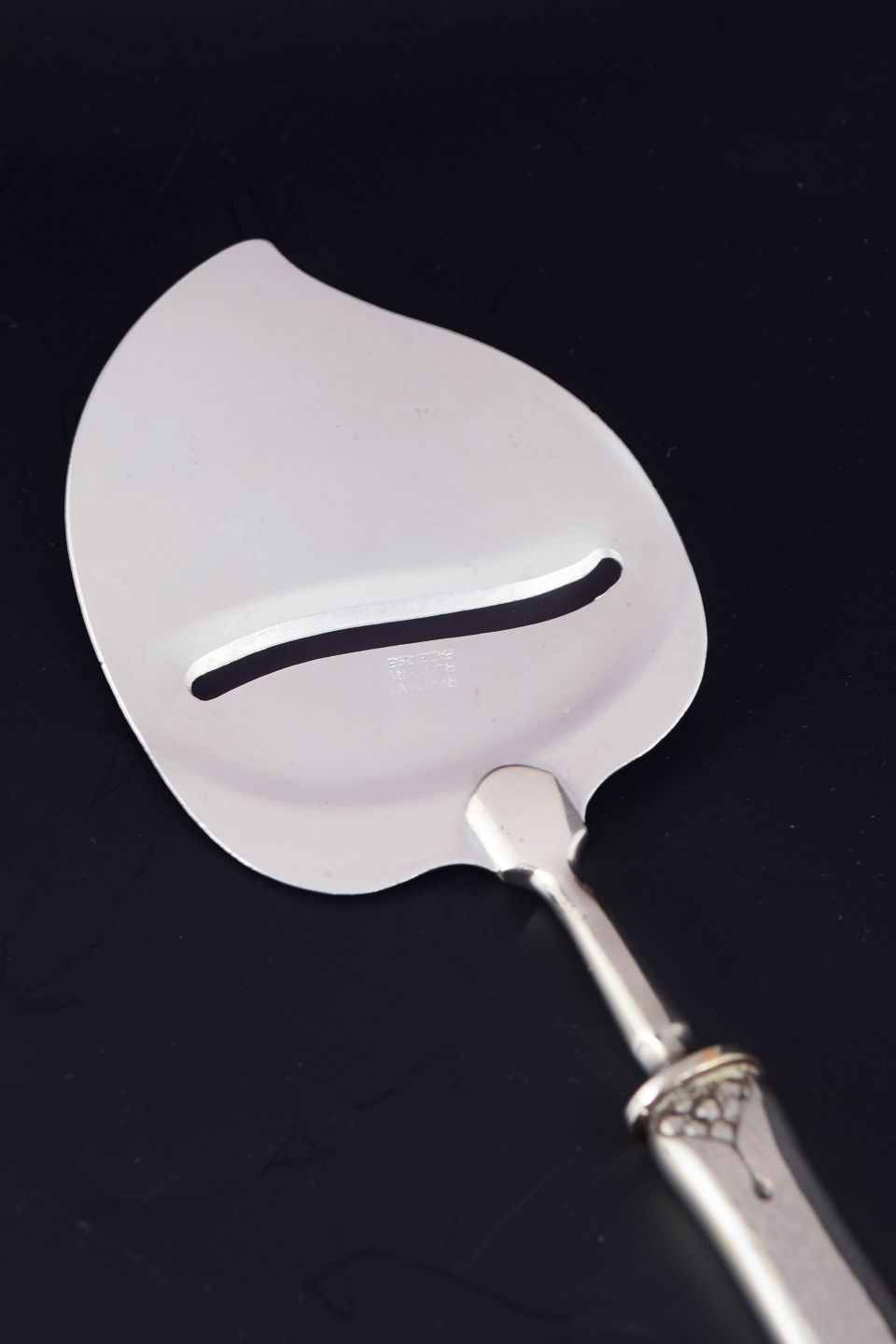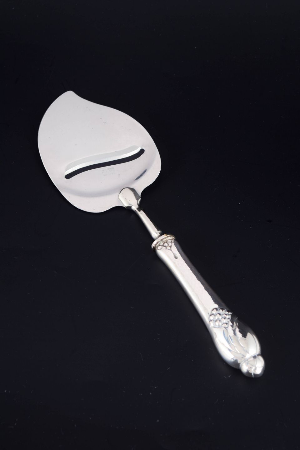 Art Deco cheese slicer in 830 silver and stainless steel. Model number 6 with a decorative handle in relief featuring a stylised floral motif. Produced by Evald Nielsen.