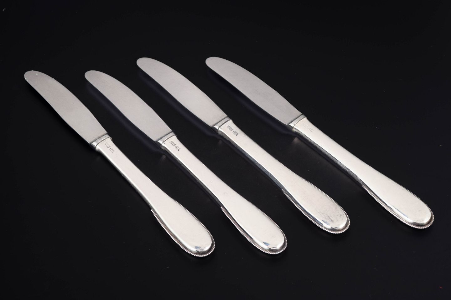 Elegant lunch knives in sterling silver and stainless steel. Model number 14 with a classic softly rounded handle with a subtle beaded edge and plain blade. Produced by Evald Nielsen.