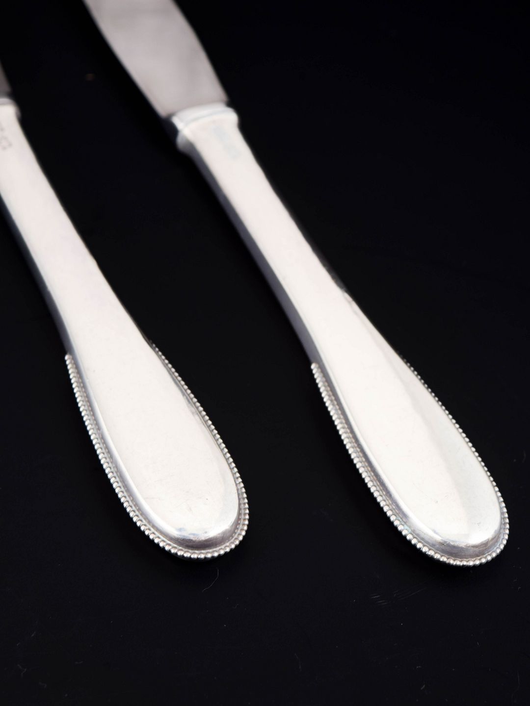Elegant lunch knives in sterling silver and stainless steel. Model number 14 with a classic softly rounded handle with a subtle beaded edge and plain blade. Produced by Evald Nielsen.