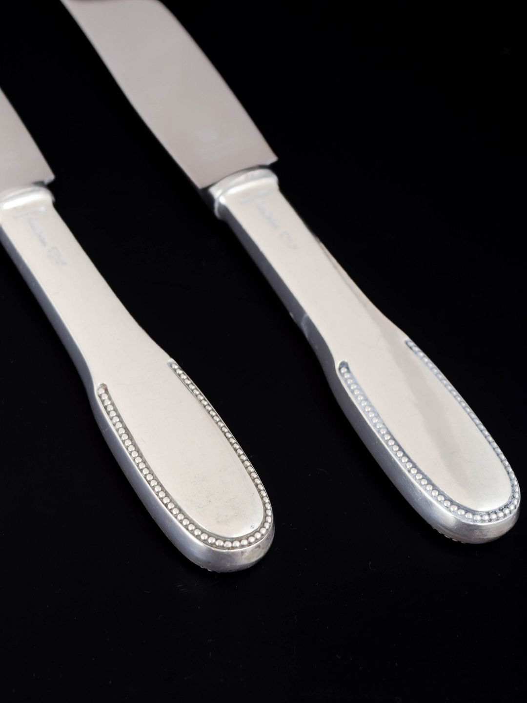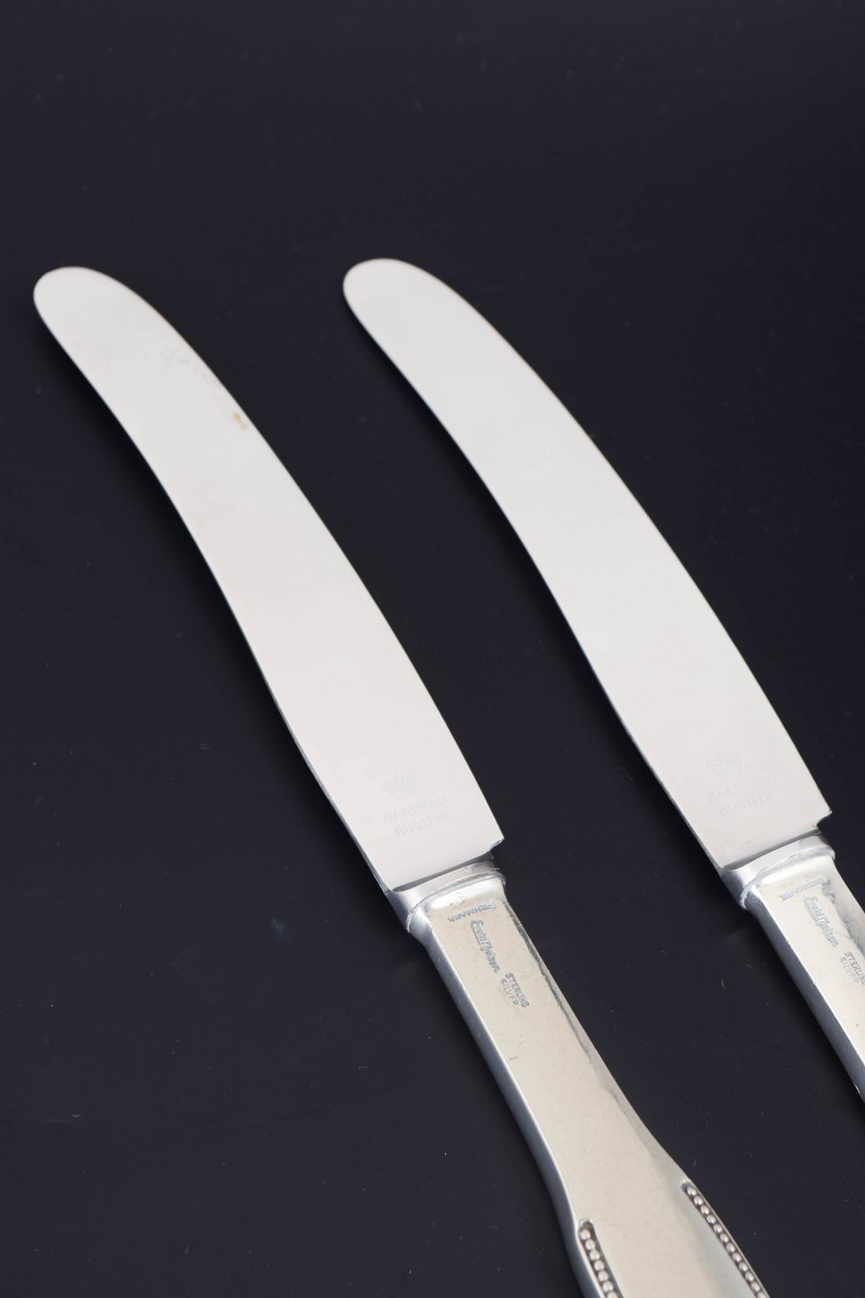 Elegant dinner knives in sterling silver and stainless steel. Model number 14 with a classic softly rounded handle with a subtle beaded edge and plain blade. Produced by Evald Nielsen.