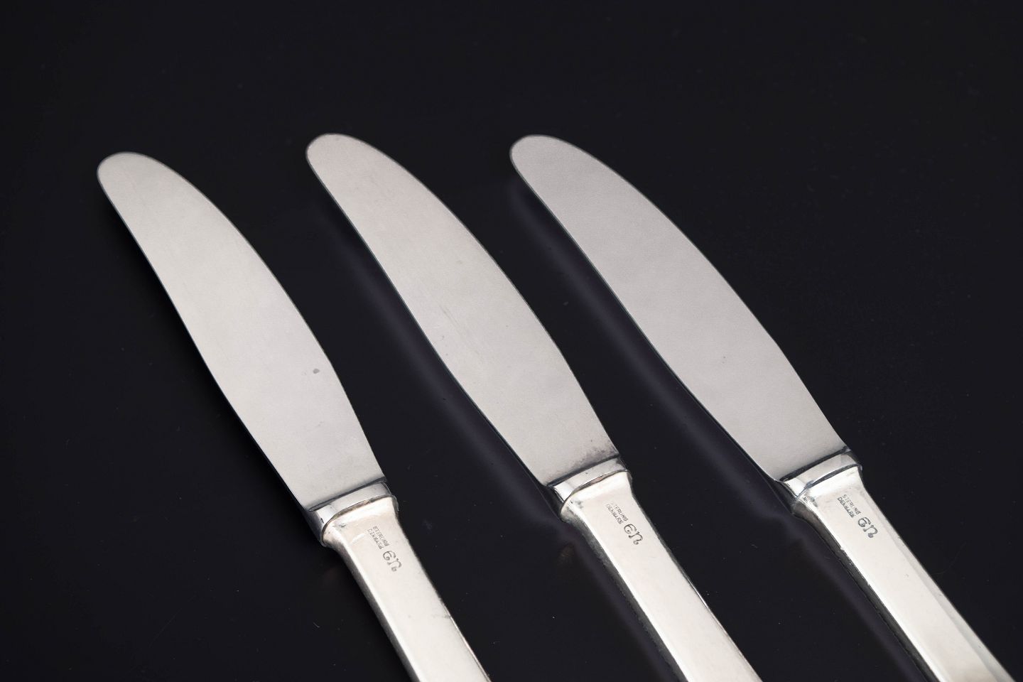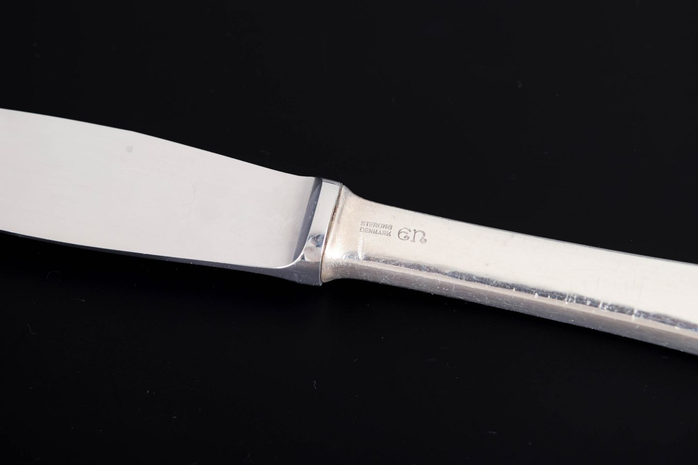 Elegant dinner knives in sterling silver and stainless steel. Model number 14 with a classic softly rounded handle with a subtle beaded edge and plain blade. Produced by Evald Nielsen.