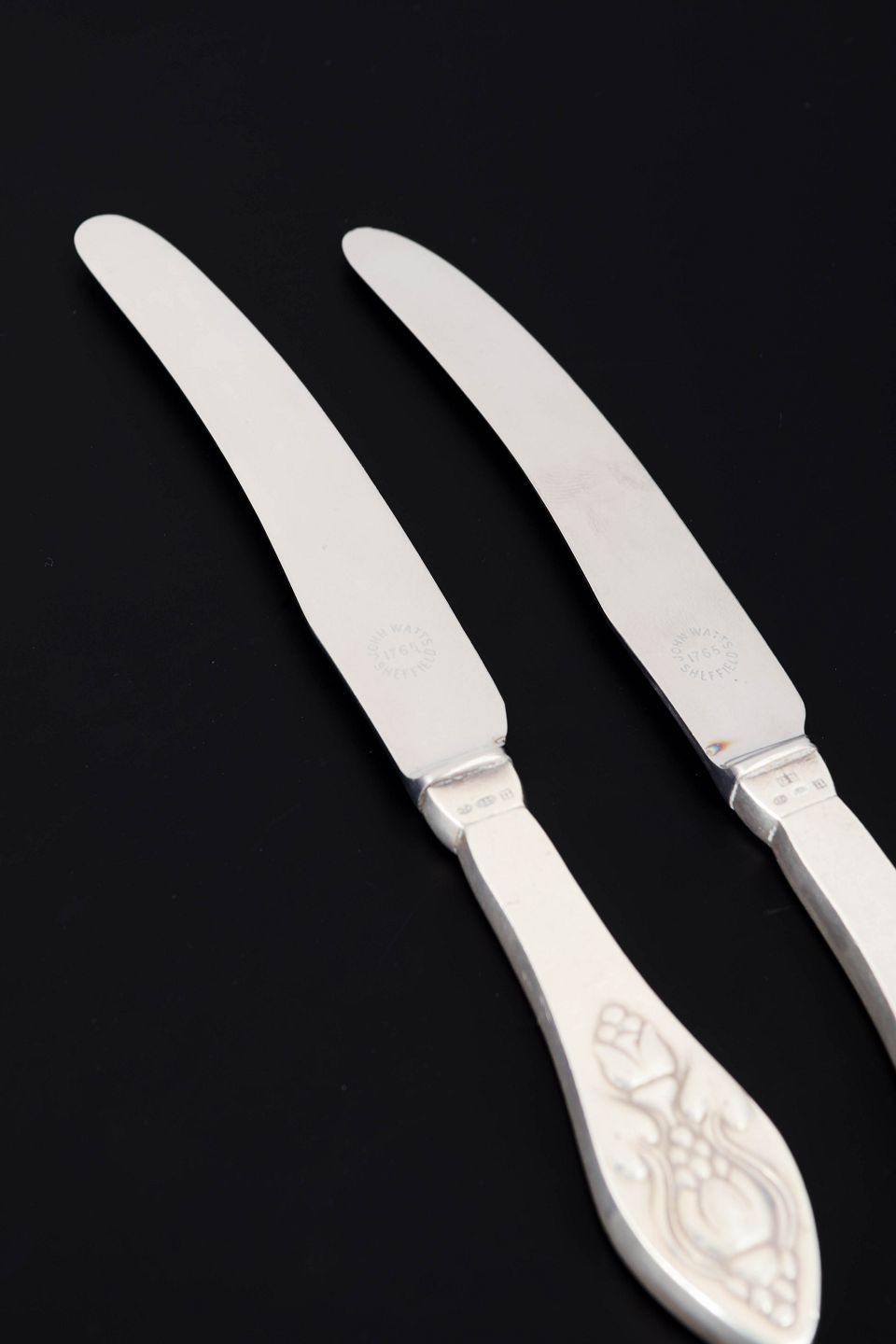 Two fruit knives in stainless steel and sterling silver in the Fuchsia pattern from Georg Jensen. The handles are decorated with a stylised floral motif inspired by the fuchsia flower, executed in relief with soft organic lines characteristic of Georg Jensen’s early Art Nouveau designs.