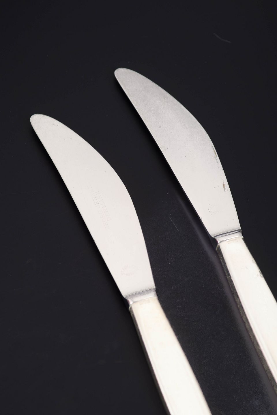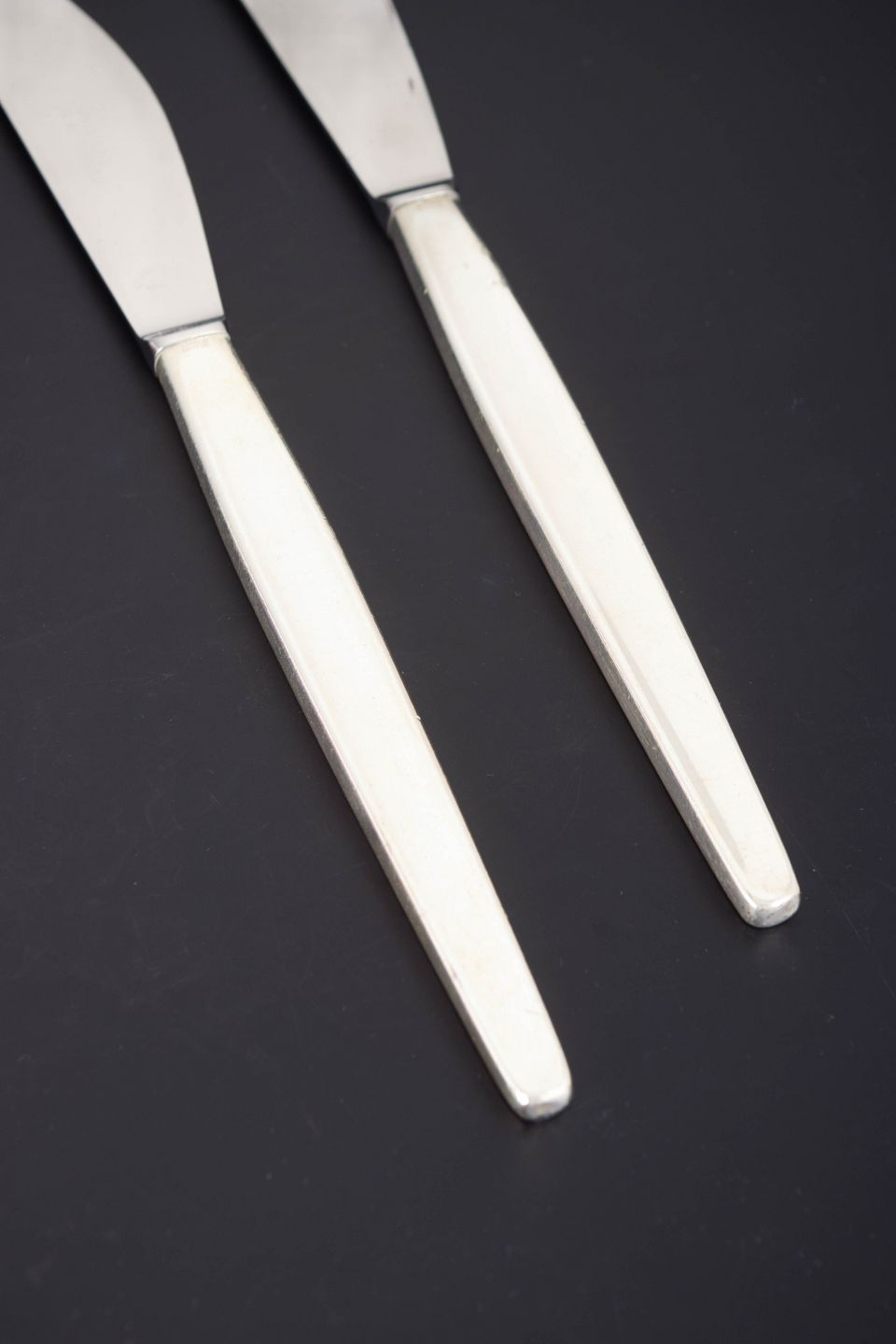 Two lunch knives in stainless steel and sterling silver in the Cypress model from Georg Jensen. The design features a slender tapered form and smooth modern lines characteristic of Georg Jensen flatware from the post-war period.