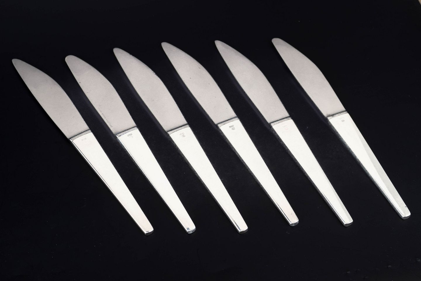 Set of six dinner knives in stainless steel and sterling silver in the Caravel model designed by Henning Koppel for Georg Jensen. The design features clean modern lines and a slender tapered form characteristic of Koppel’s functionalist approach.