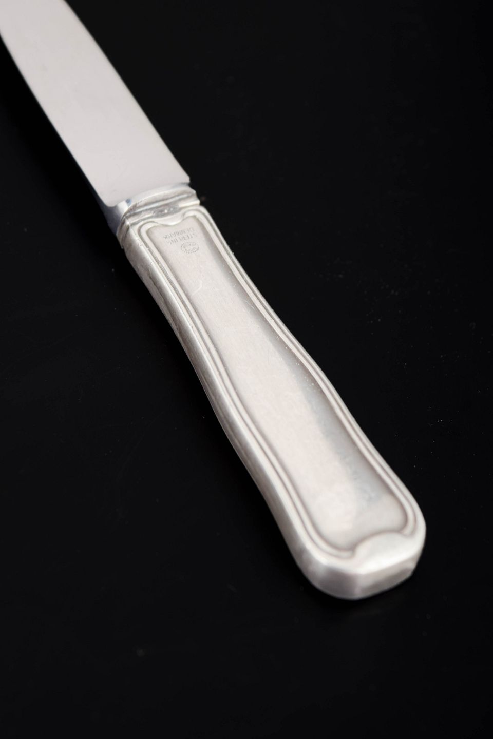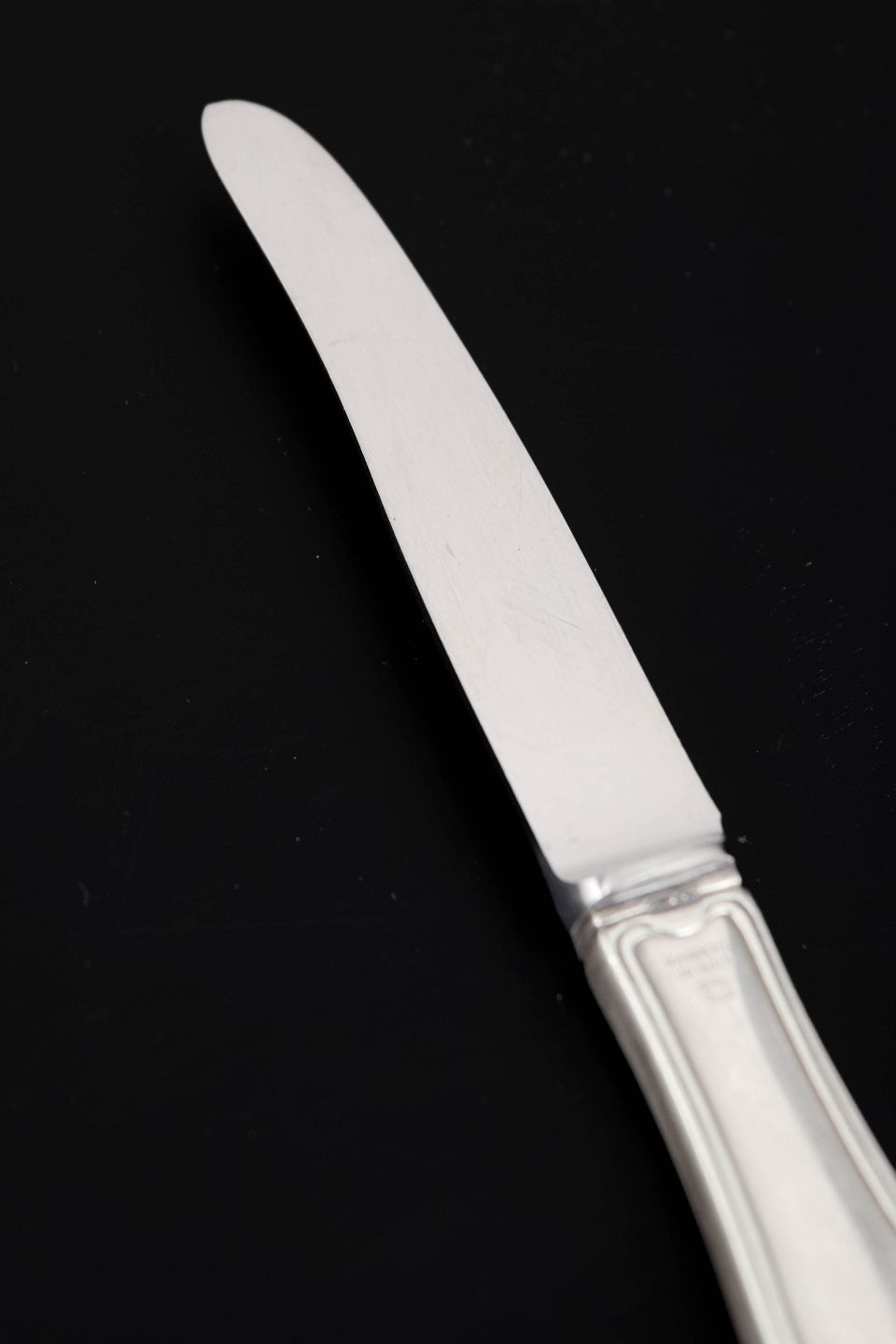 Travel knife in stainless steel and sterling silver with handle in the Old Danish pattern. The knife features a slender stainless steel blade and an elegant silver handle with the characteristic double reeded border that defines this classic Georg Jensen design.