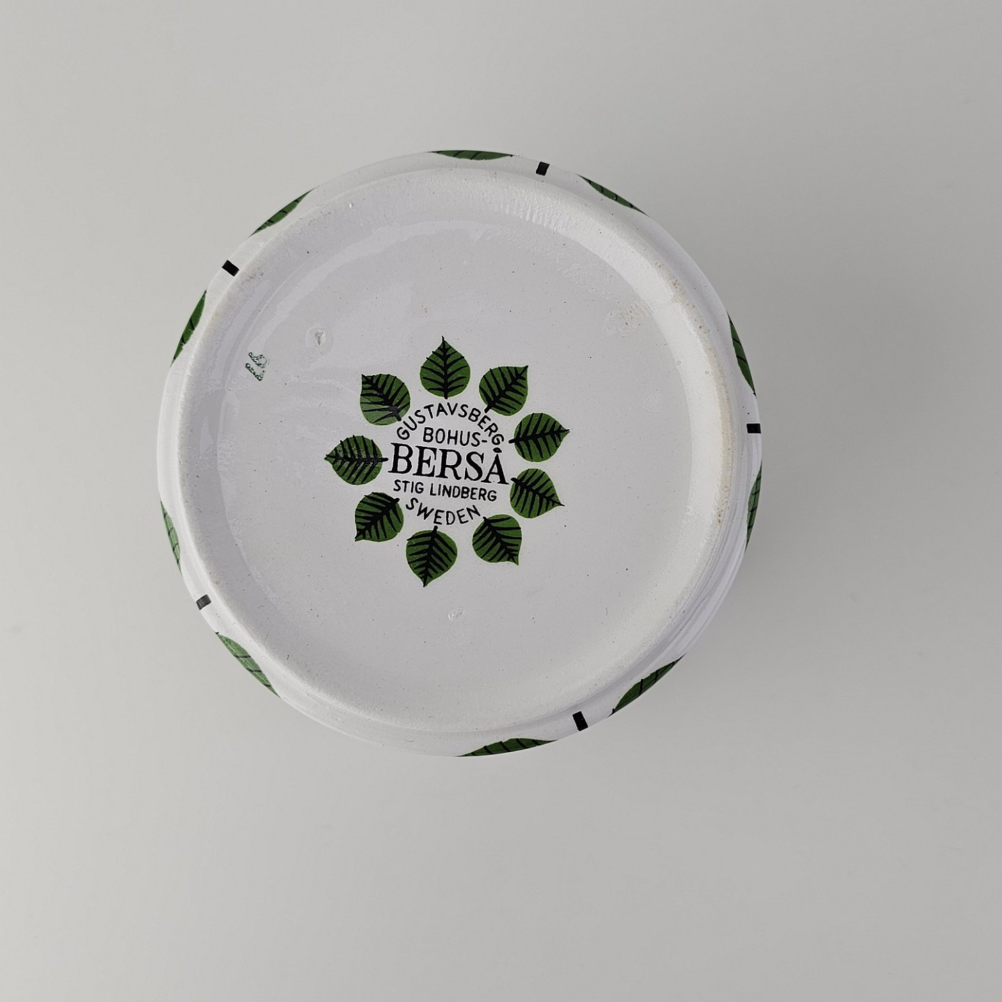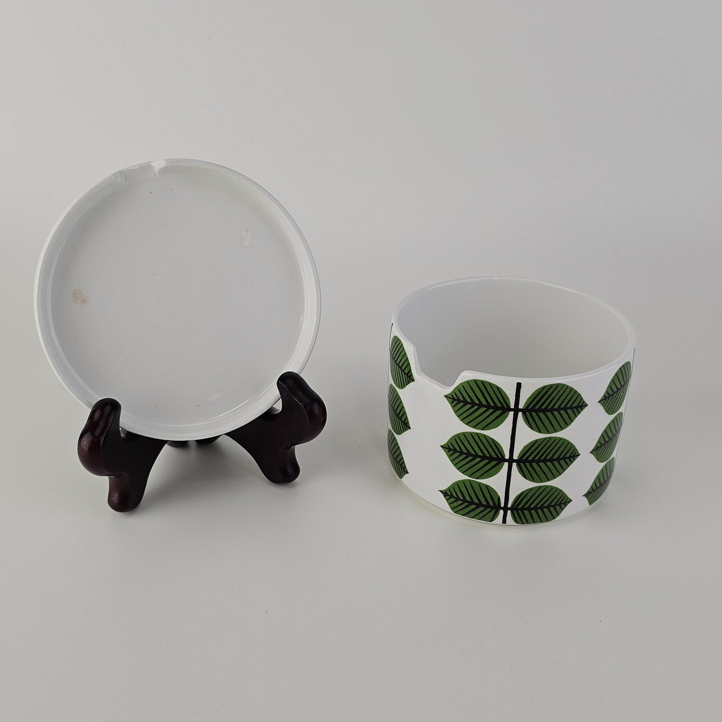 Stel i hvidt porcelæn med dekoration af grønne blade.