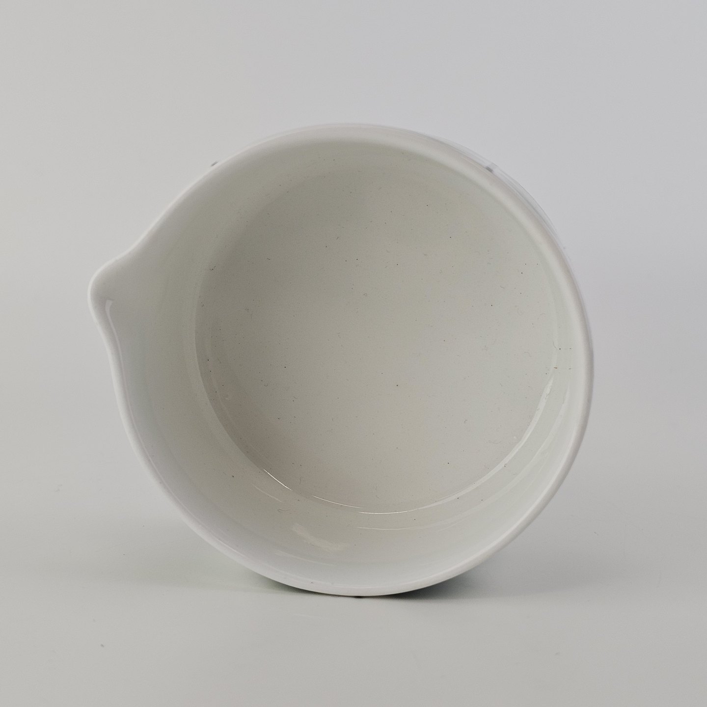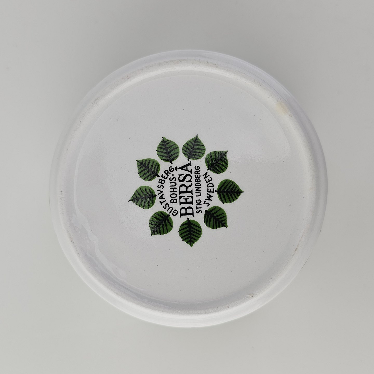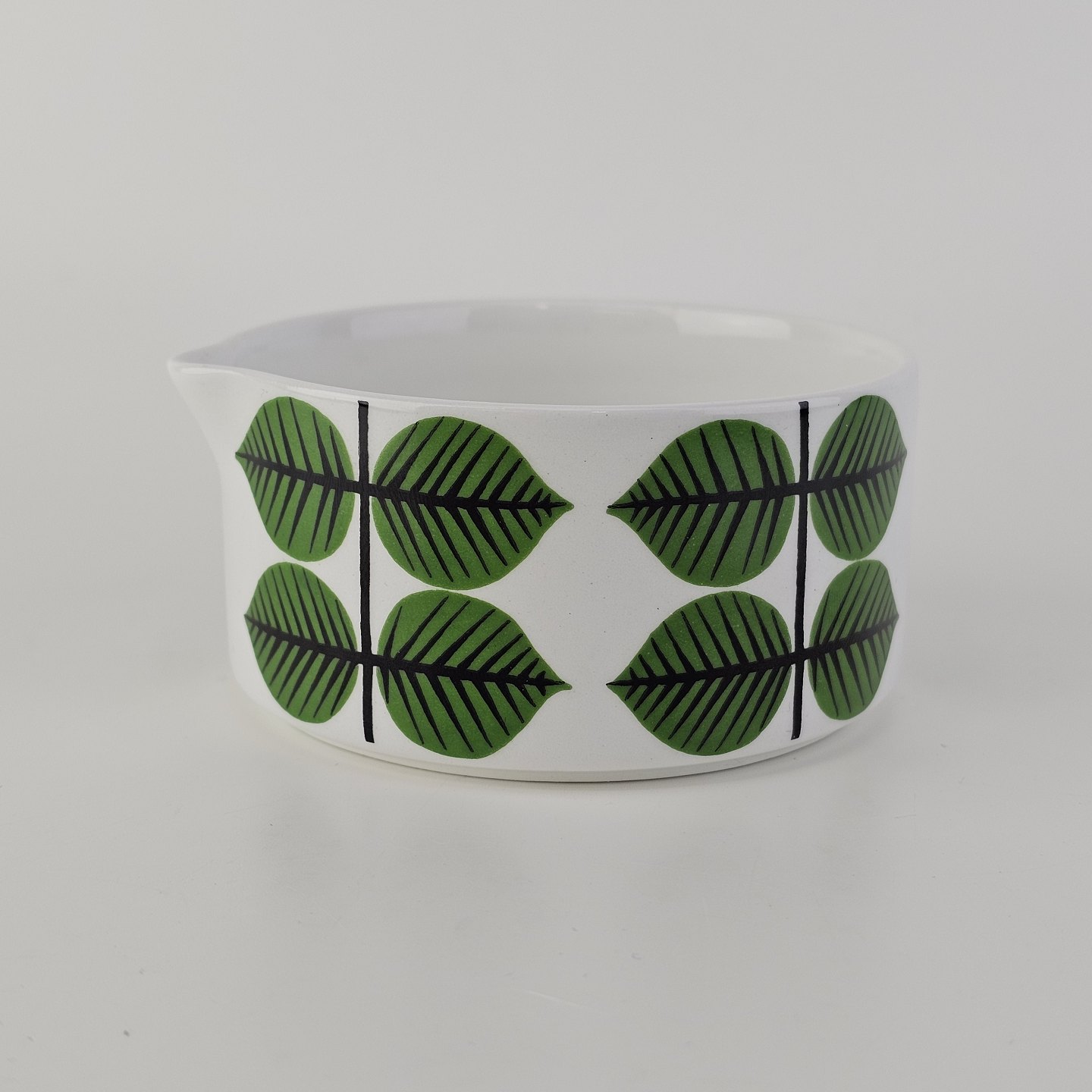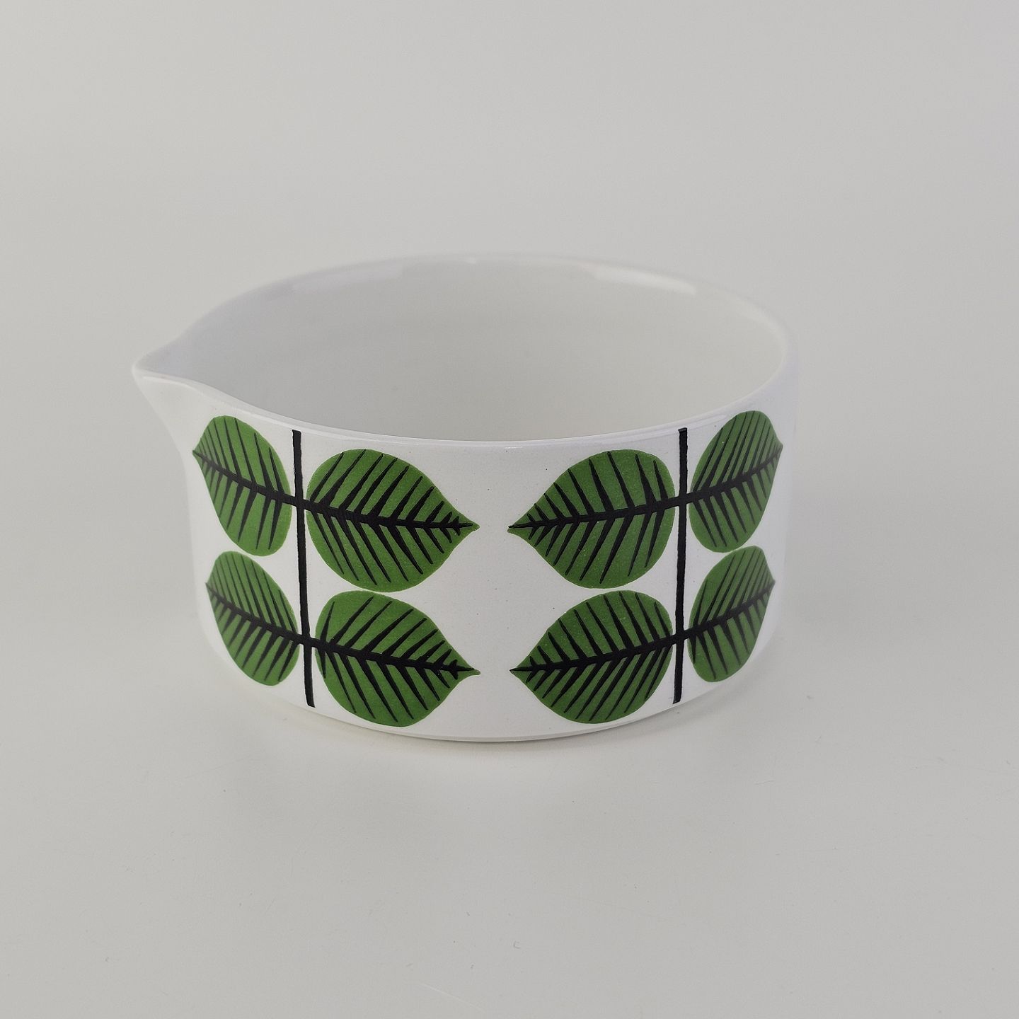 Stel i hvidt porcelæn med dekoration af grønne blade.