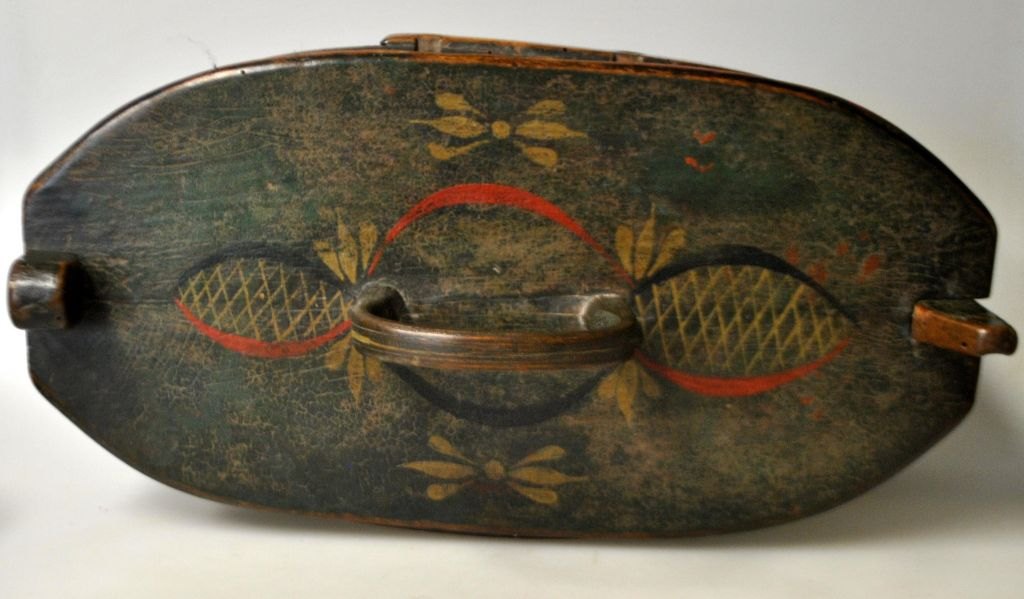 Wooden lunch box with lid, approx. 1820-1830, Denmark. Painted in green with red and golden decoration. H. incl. handle: 19.5 cm. L: 34 cm. W: 18 cm.