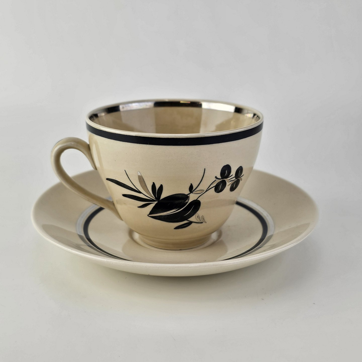 Råhvidt fajancestel i stelform E med dekoration af naturmotiver i sølv og sort farve.
