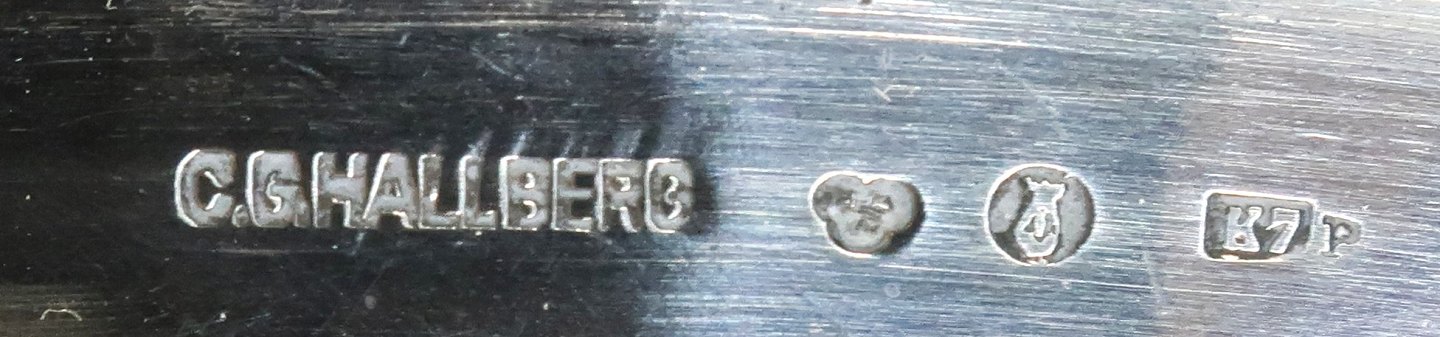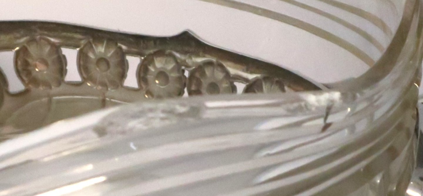 C.G.Hallberg, Sweden. Large jardinere of silver with glass insert (830). Length 46 cm. Produced 1912 (K7). There are 2 chips on the glass (see photo).