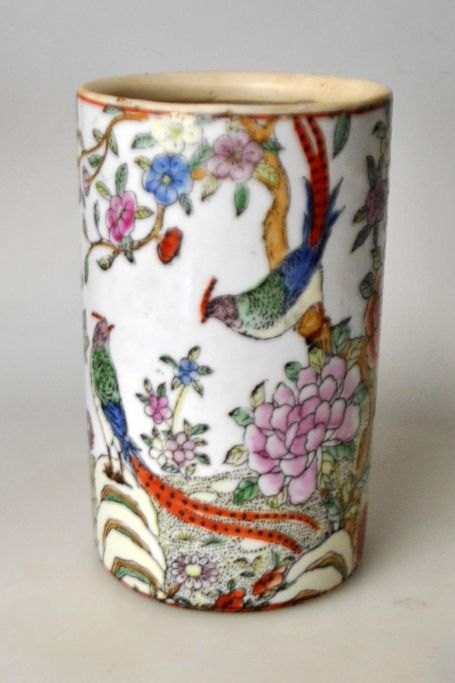 Chinese porcelain brush cup, 20th century. With decoration in transfer technique in the form of birds and flowers. Stamped. H.: 12.5 cm.