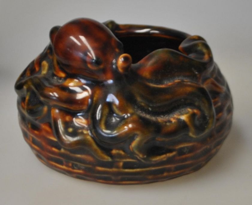 Faience bowl, approx. 1900. Brown glazed. Decorated with an octopus by a basket. H.: 7.5 cm. Dia.: 12.5 cm.