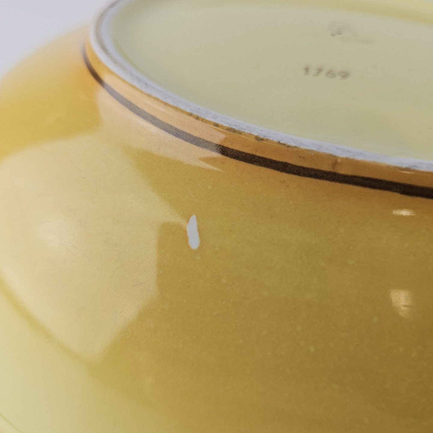 Fajancestel i stelform C med dekoration i gule nuancer med grøn stribe.