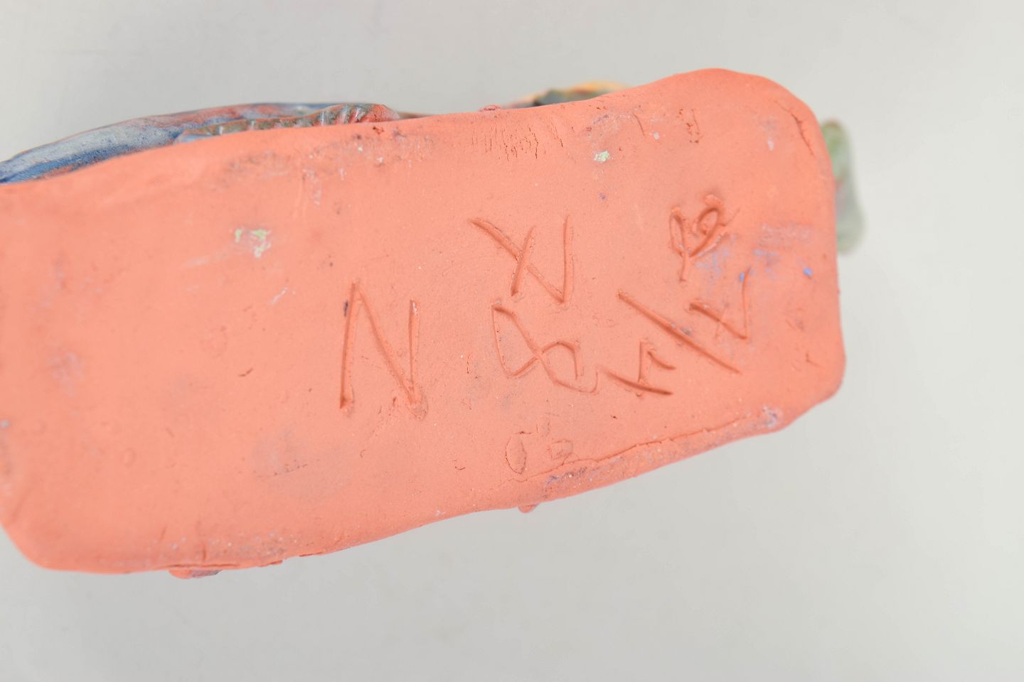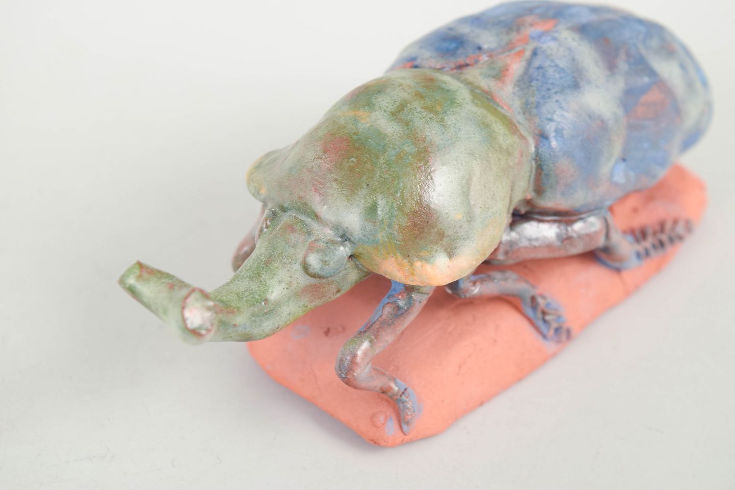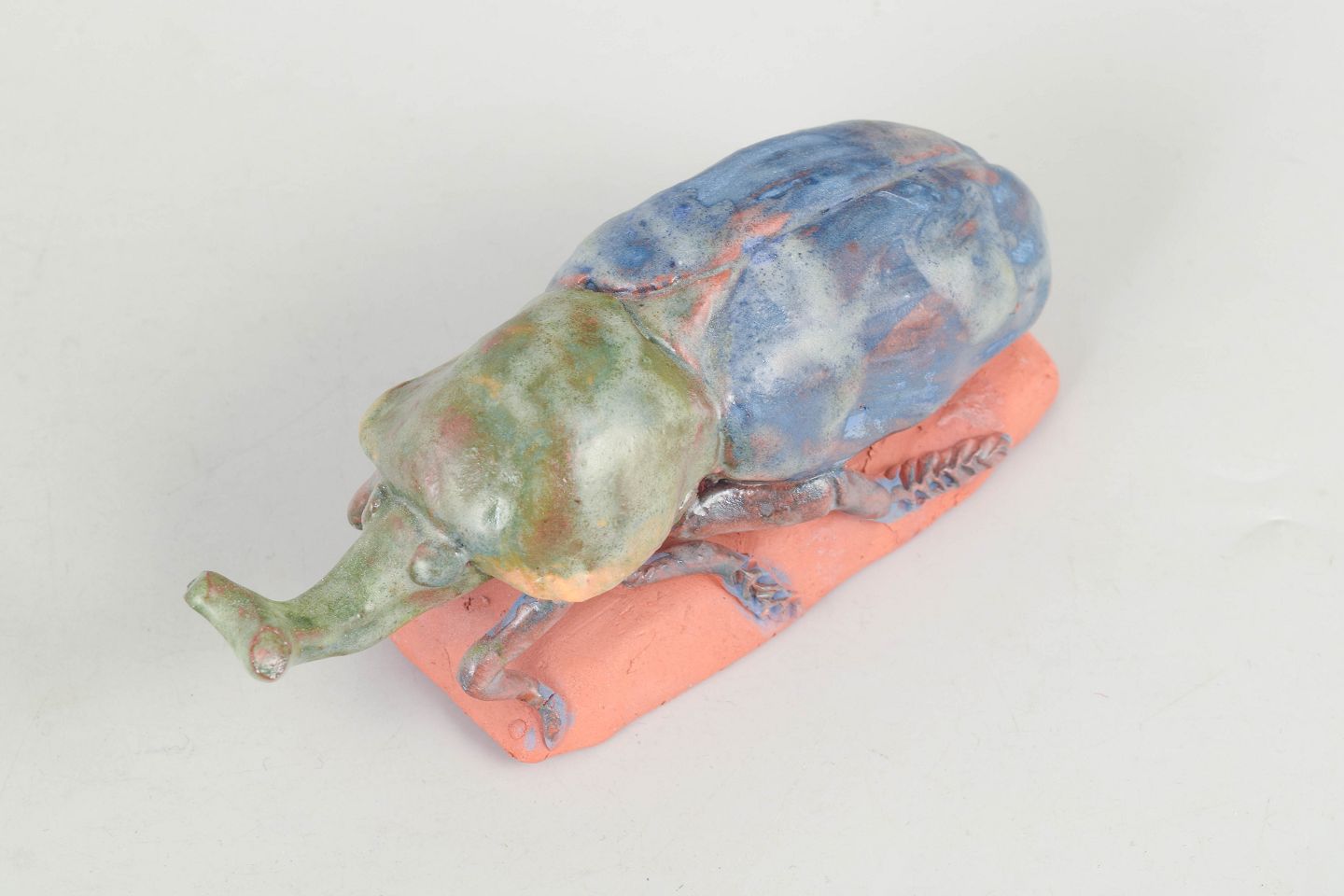Unique ceramic sculpture depicting an insect executed in stoneware with multicoloured glaze in green, blue and brown tonal nuances. The figure is modelled with naturalistic detailing and placed on a small clay base, giving the piece a sculptural and lively character. Signed and dated 1978.