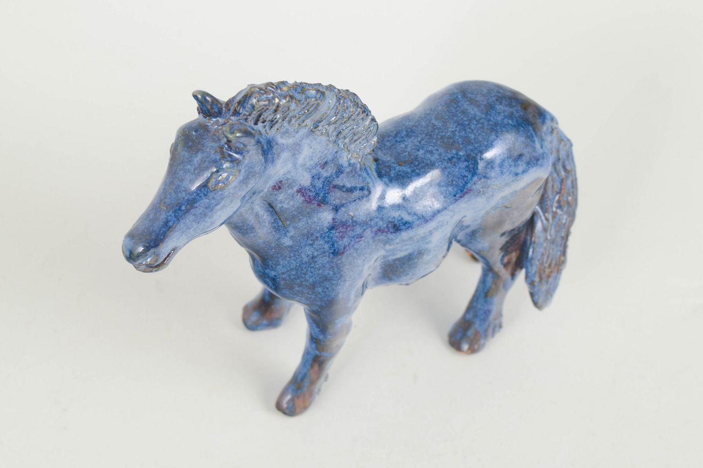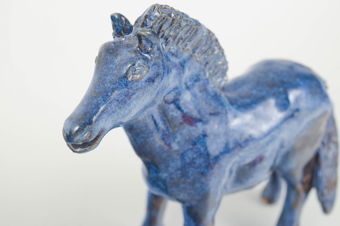 Unique ceramic sculpture depicting a foal executed in stoneware with glossy glaze in blue tones with brown nuances. The figure is modelled with a natural posture and detailed mane and head, giving the piece a lively and expressive character. Unsigned unique work from the 1970s.