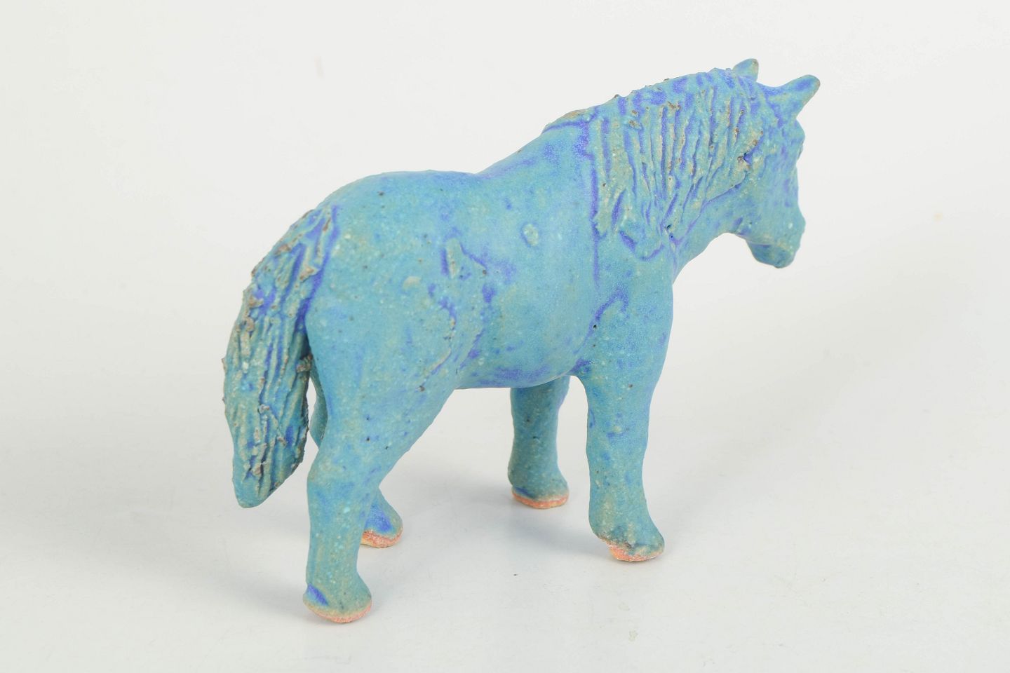 Unique ceramic sculpture depicting a pony executed in stoneware with blue-green glaze and subtle tonal variations across the surface. The figure is modelled with a natural posture and detailed mane and tail, giving the piece a lively and expressive character. Unsigned unique work from the 1970s.