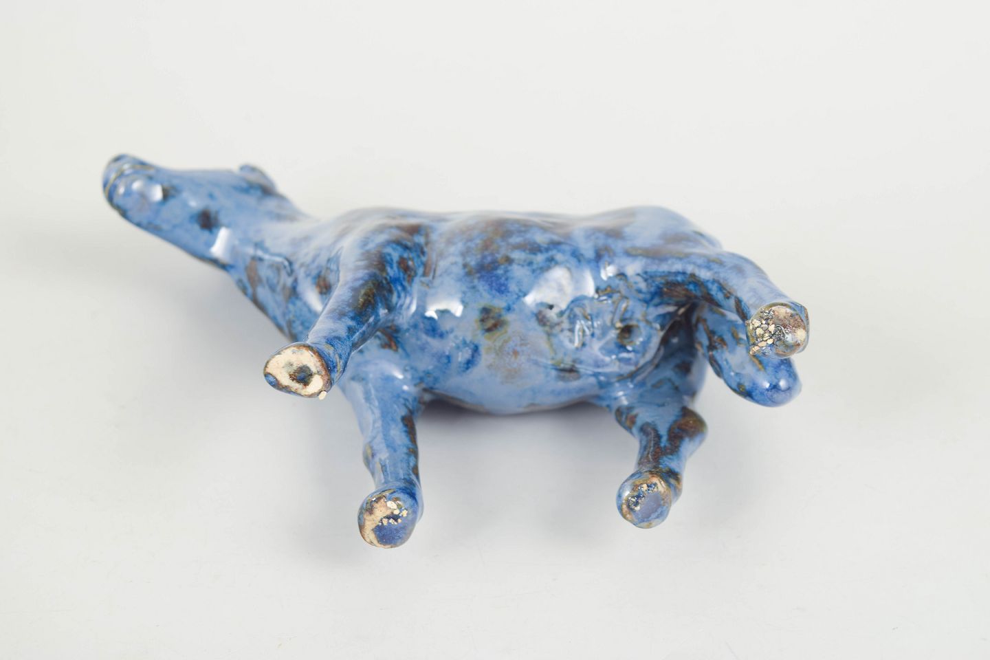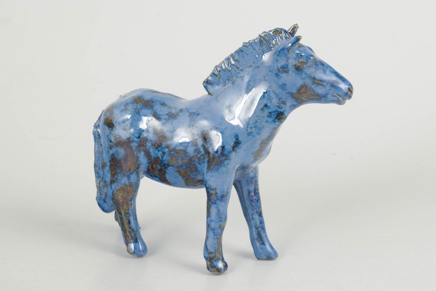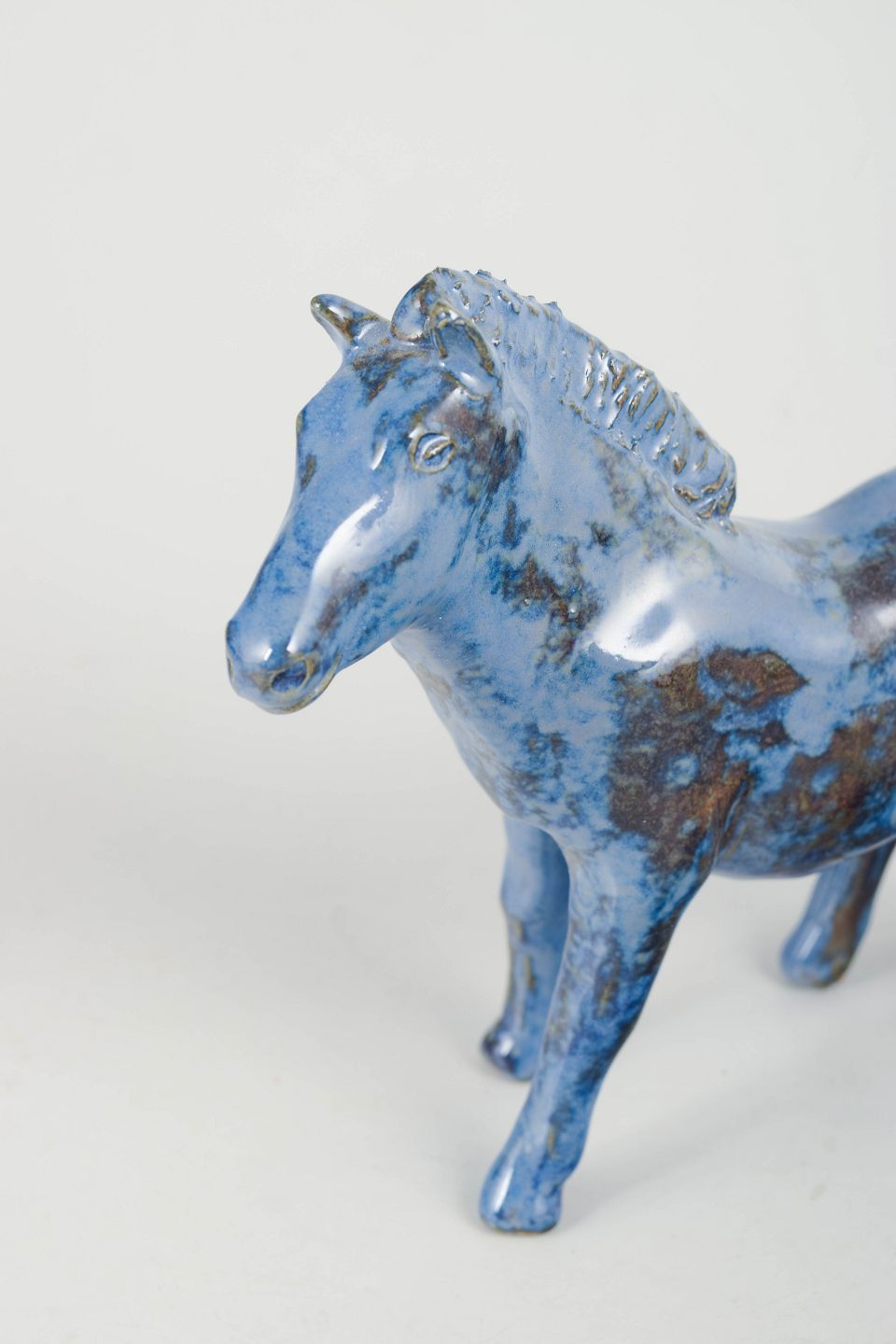 Unique ceramic sculpture depicting a foal executed in stoneware with glossy glaze in blue tones with brown nuances. The figure is modelled with a natural posture and detailed mane and head, giving the piece a lively and expressive character. Unsigned unique work from the 1970s.