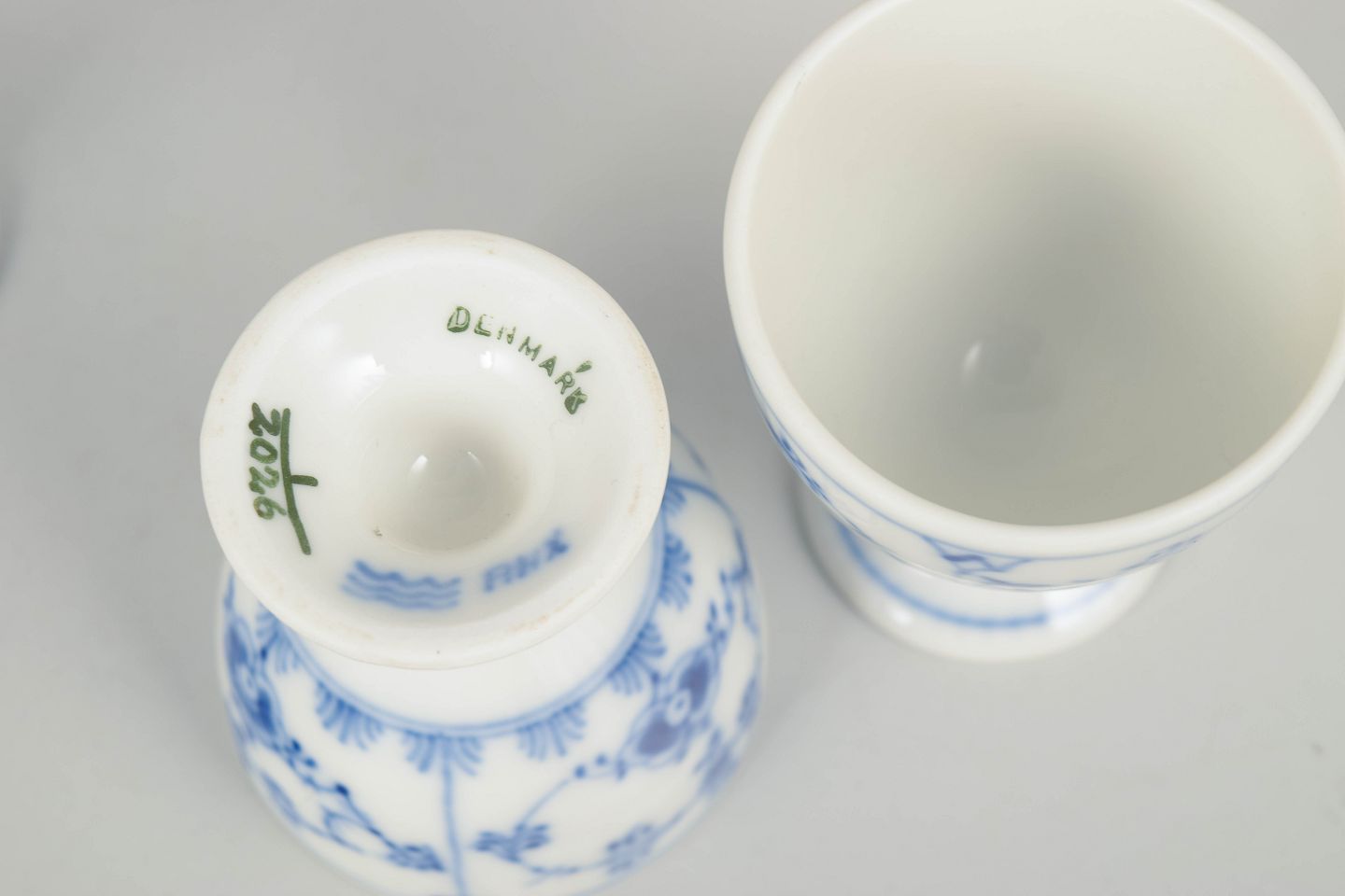 Set of four hand-painted porcelain egg cups decorated with the classic blue fluted pattern in cobalt underglaze. The egg cups feature a rounded bowl with small foot and are decorated with the characteristic floral motifs and stylised garlands of the series.