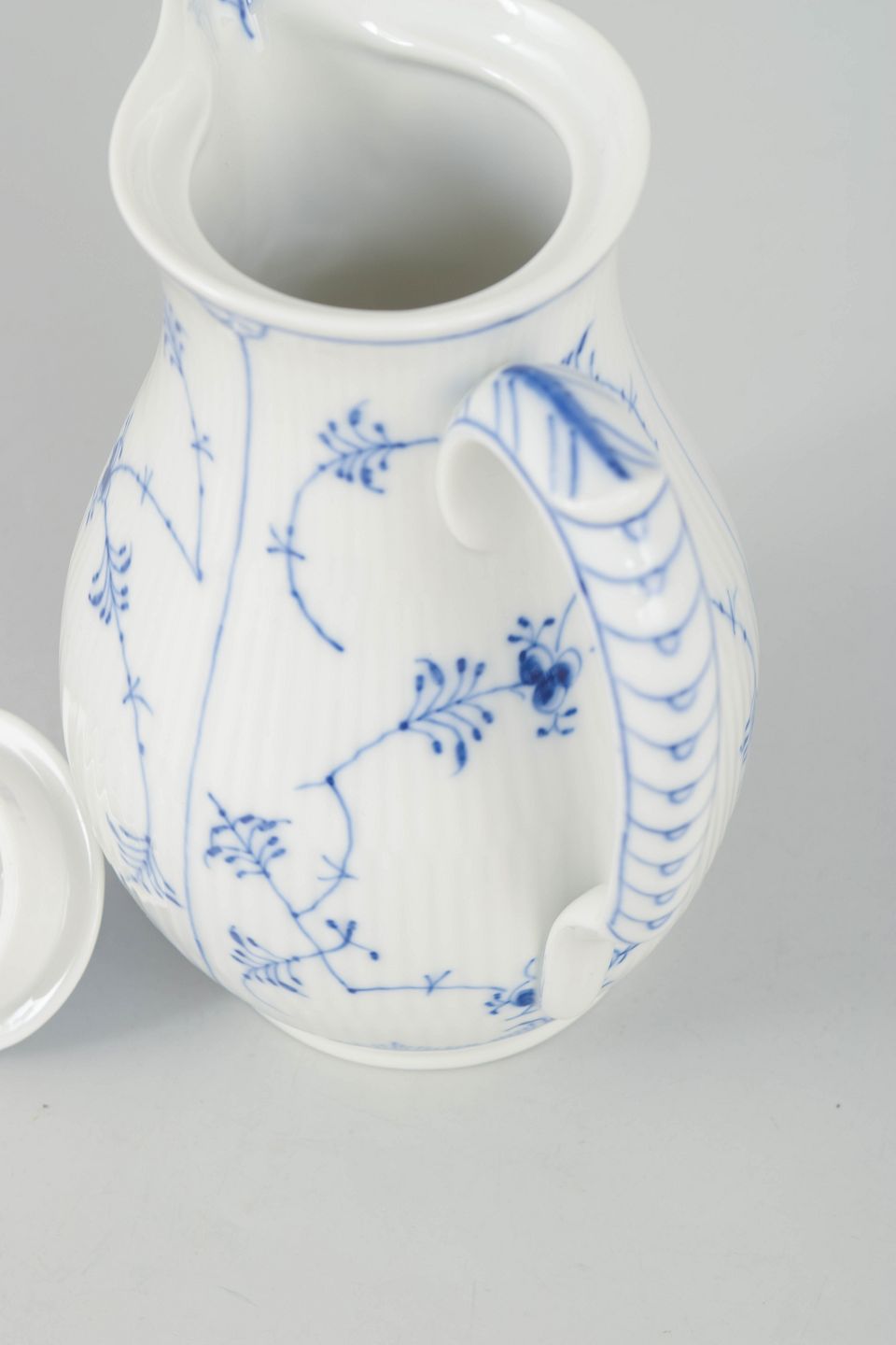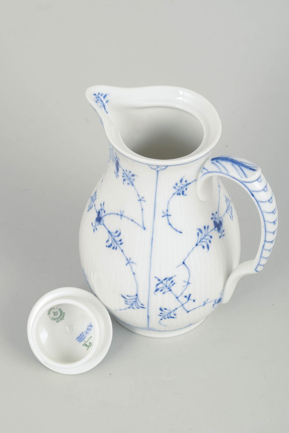 Rare hand-painted porcelain chocolate pot decorated with the classic blue fluted pattern in cobalt underglaze. The elegant form features a tall body with curved spout, shaped handle and domed lid with finial. Marked underneath with the Royal Copenhagen factory mark and first factory quality. Model 1/30.