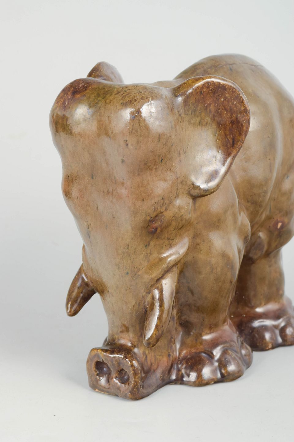 Naturalistic elephant sculpture executed in glazed stoneware with warm brown tonal variations and a lively glaze surface. The figure is modelled with a soft, organic form and expressive character, typical of Poul Kyhn’s animal sculptures. Signed and appearing as a unique piece from the artist’s early production.