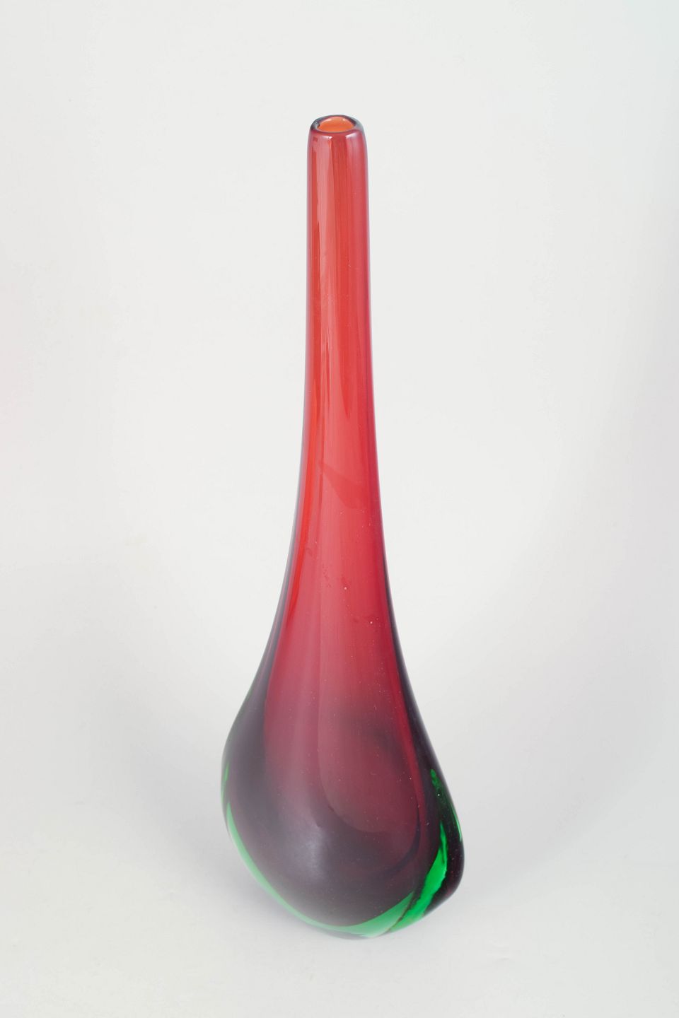 Elegant art glass vase in clear glass with encased red core and green tone at the base, featuring a very long slender neck and sculptural teardrop form typical of Murano glass.
