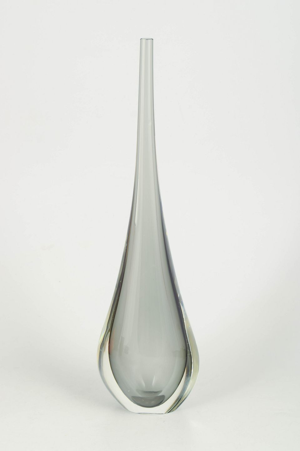 Slender art glass vase in clear glass with elegant drop-shaped silhouette and long narrow neck, characteristic of Murano glass with a heavy base and refined sculptural form.