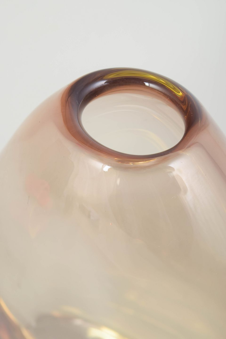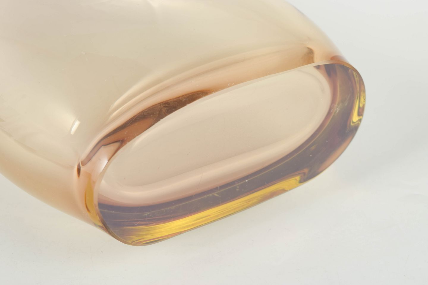 Elegant art glass vase in clear glass with warm amber tone and softly organic form, characteristic of Murano glass with a heavy base and sculptural silhouette.
