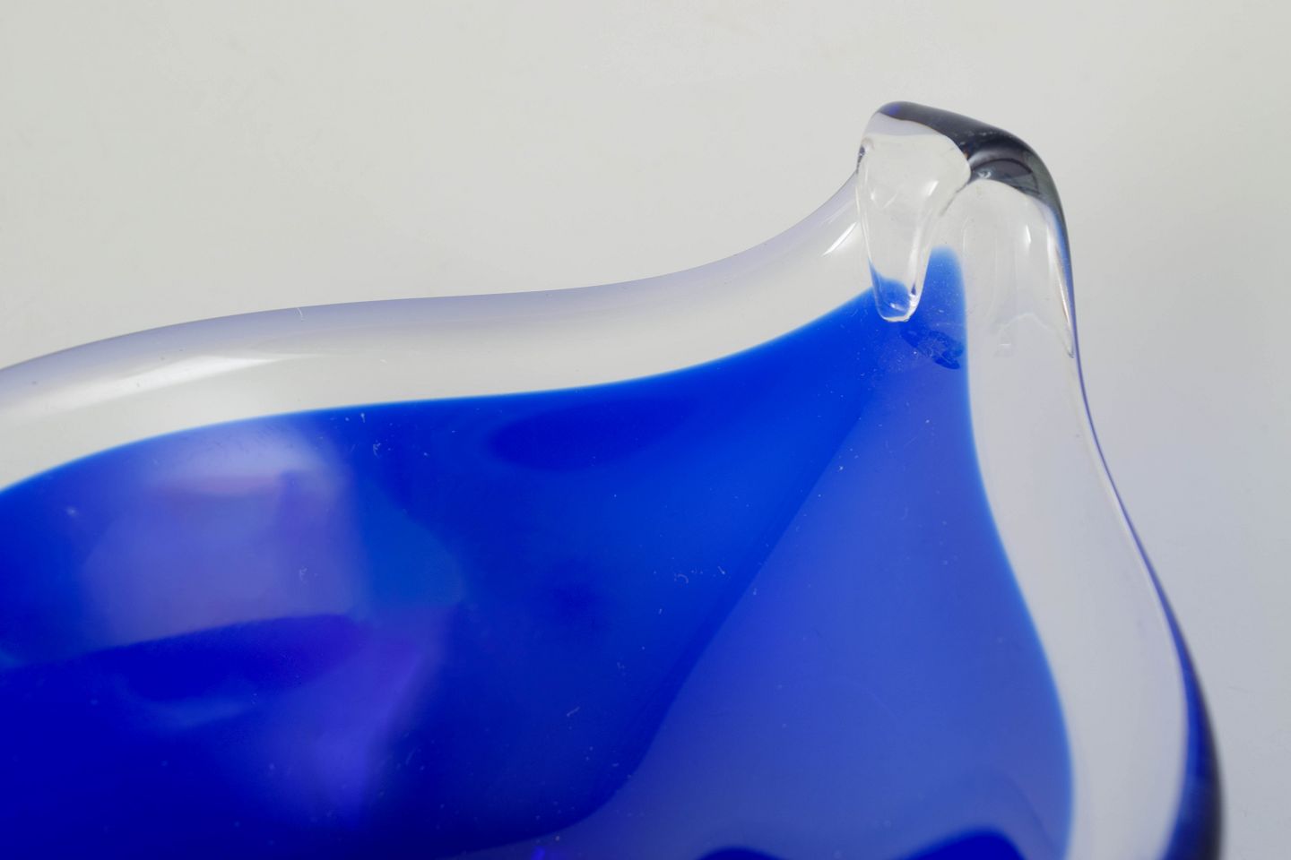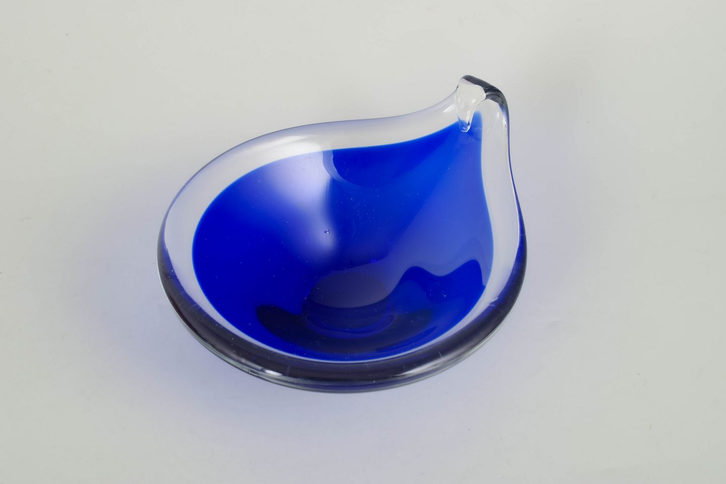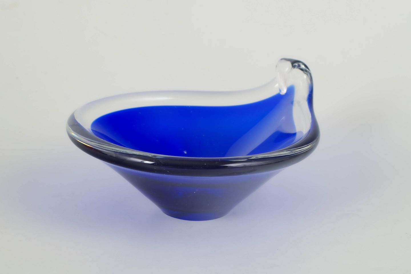 Organically shaped glass bowl in deep blue glass with clear rim and softly flowing edge, produced in the classic Murano art glass tradition.