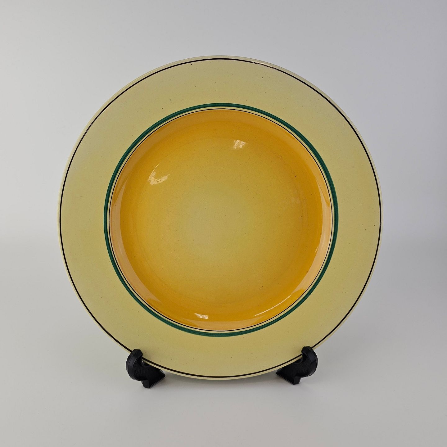 Fajancestel i stelform C med dekoration i gule nuancer med grøn stribe.