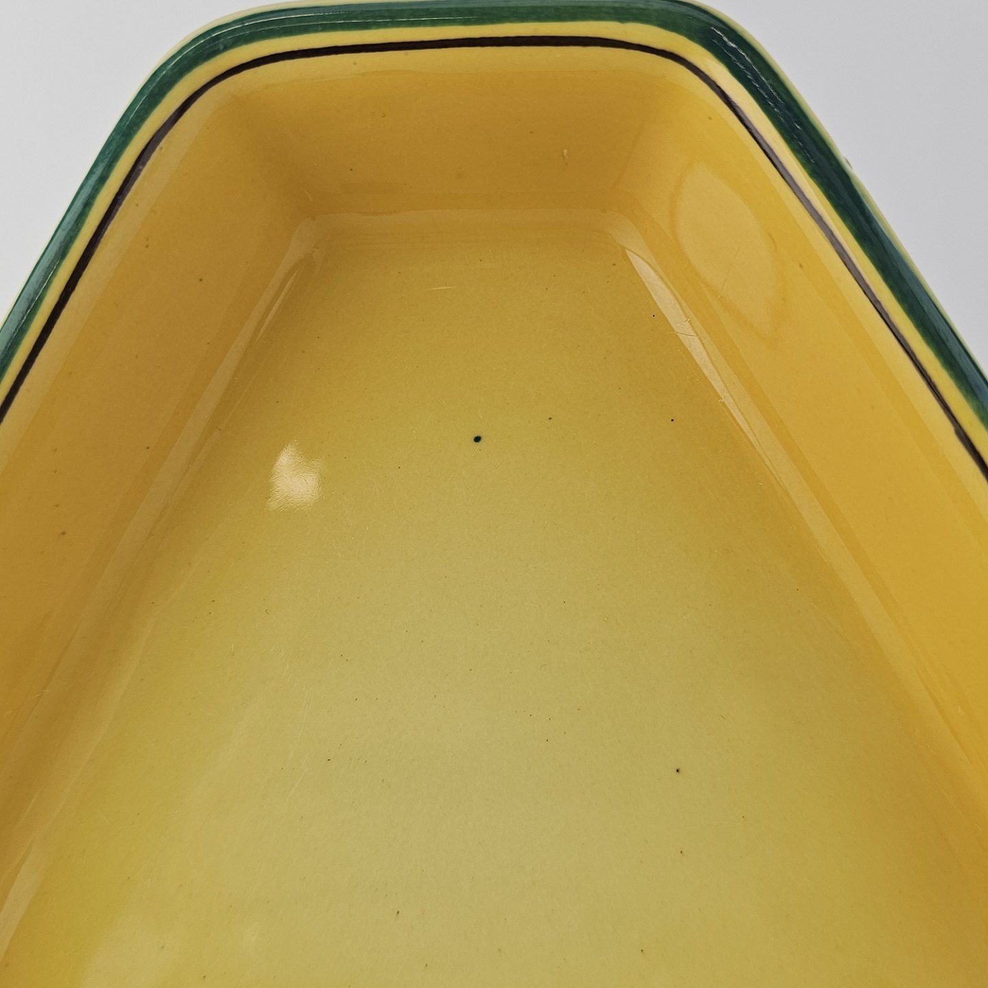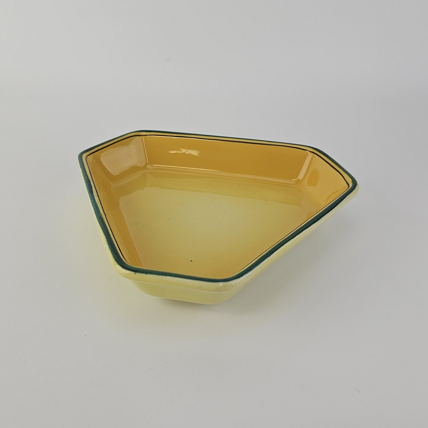 Fajancestel i stelform C med dekoration i gule nuancer med grøn stribe.