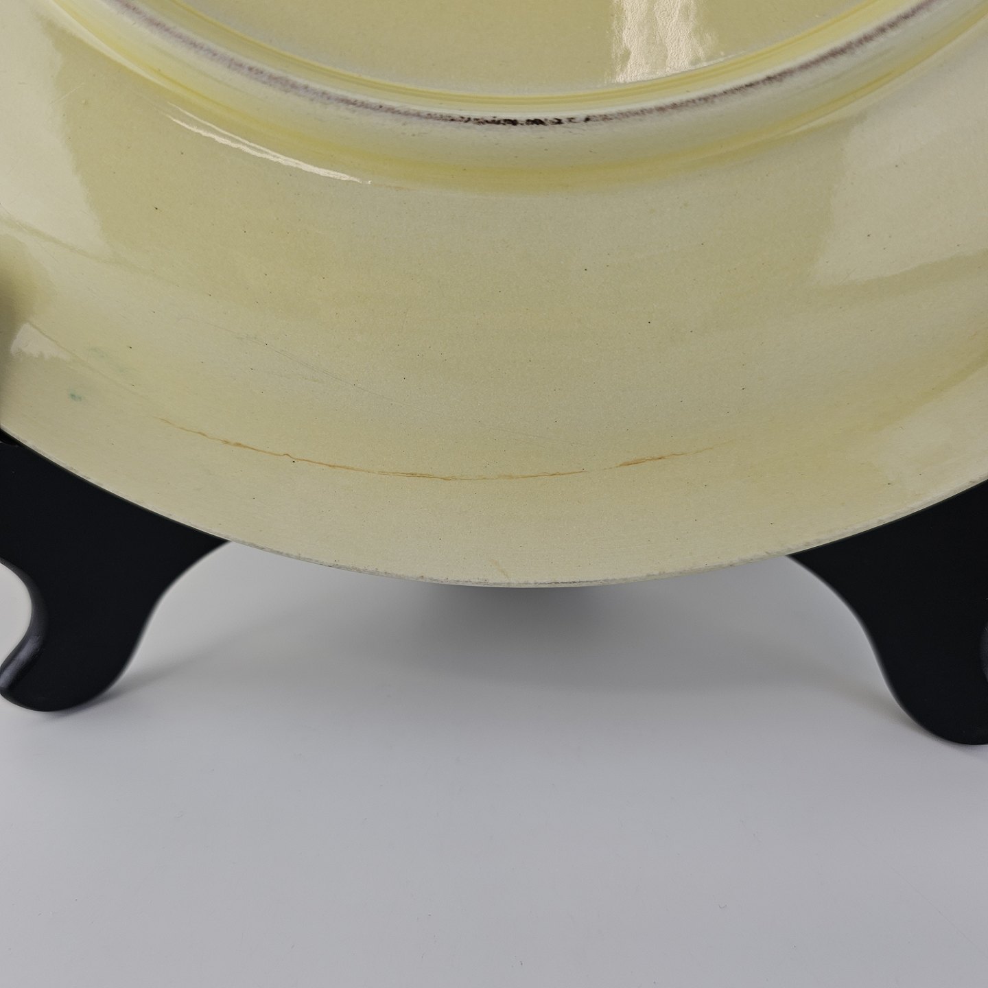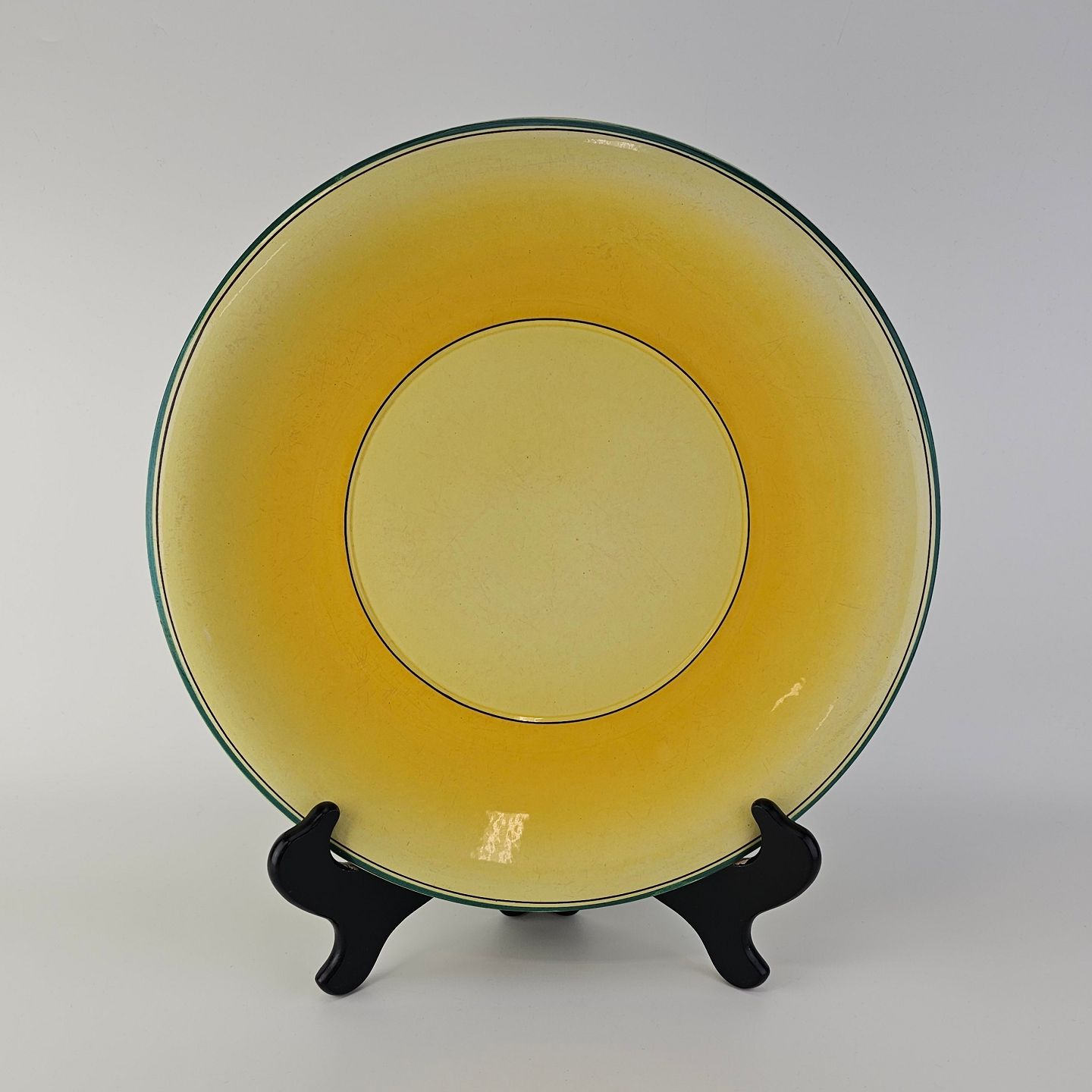 Fajancestel i stelform C med dekoration i gule nuancer med grøn stribe.