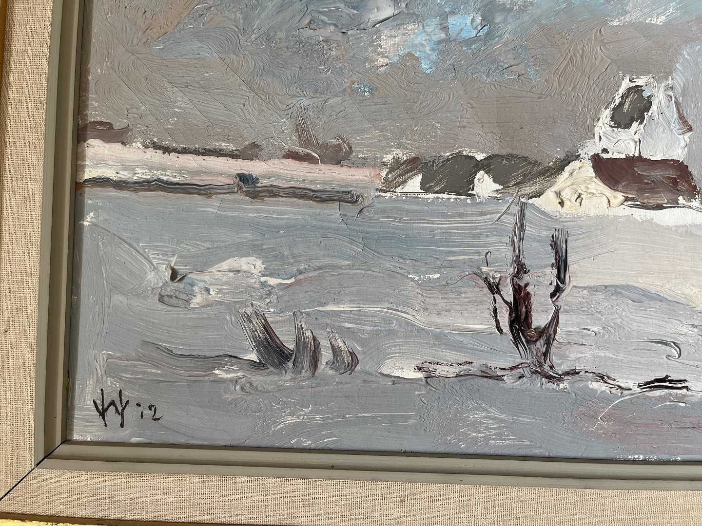 Maleri af William Hansen - Vinterpart fra Vejlby Kirke ved Strib 1972.